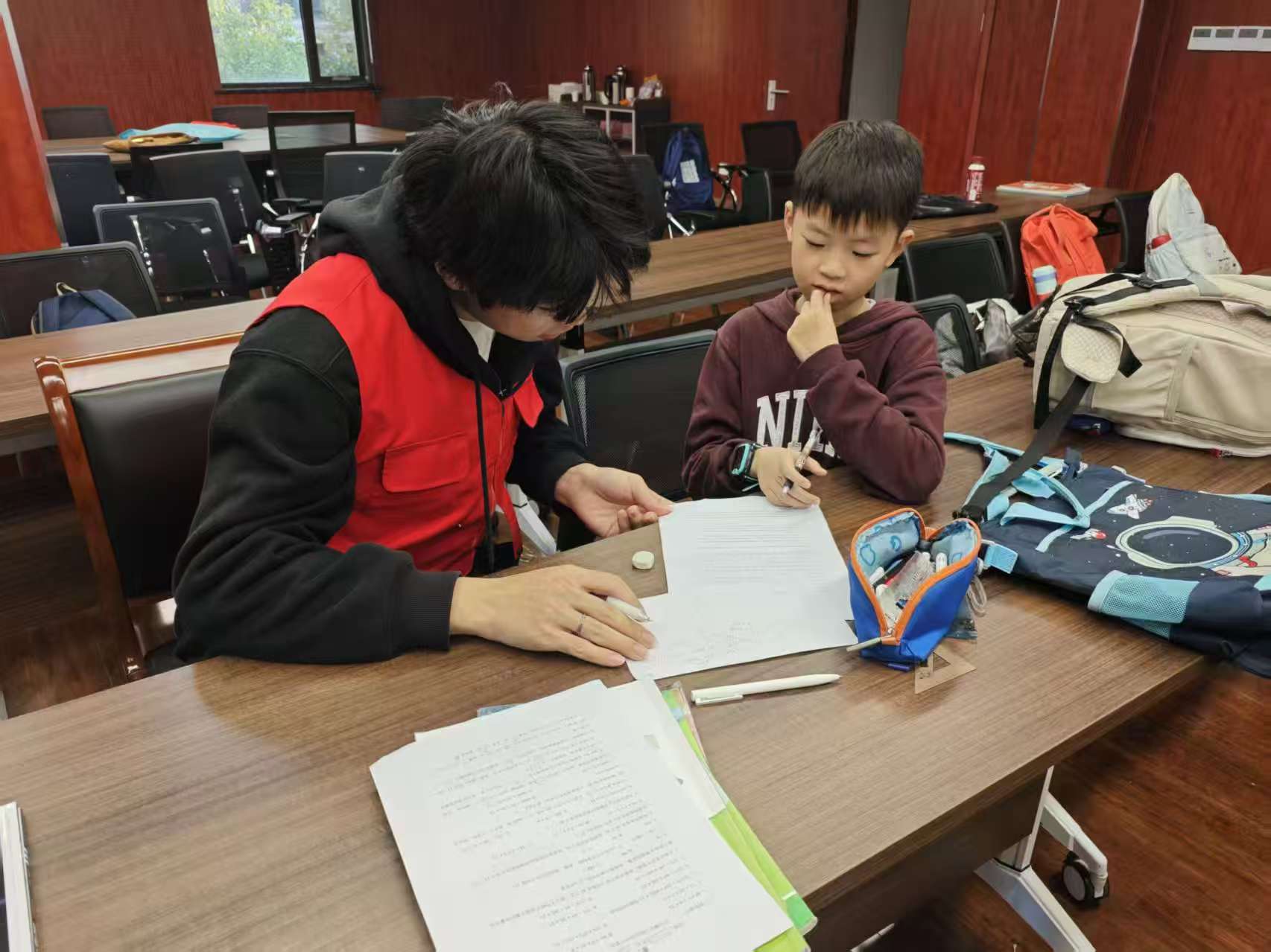 活动前期,党支部与社区工作人员对接,详细了解了参与孩子的年级分布、学科薄弱点及作业辅导需求,并提前制定了“一对一精准对接、多对一重点帮扶”的服务方案,确保辅导工作更具针对性和实效性。活动开始后,志愿者迅速进入角色,与孩子们亲切交流,耐心询问当天的作业内容和学习困惑。在数学作业辅导区,志愿者用简洁易懂的语言为孩子梳理解题思路,通过画图、举例等方式帮他攻克几何难题;语文学习角里,志愿者逐字逐句指导孩子修改作文,从段落结构到语句表达给出细致建议;英语练习中,志愿者则结合自身学习经验,教孩子掌握单词记忆技巧,纠正发音问题。对于学习节奏较慢的孩子,志愿者们格外有耐心,放慢讲解速度,反复答疑直到孩子完全理解,整个课堂氛围温馨而有序。