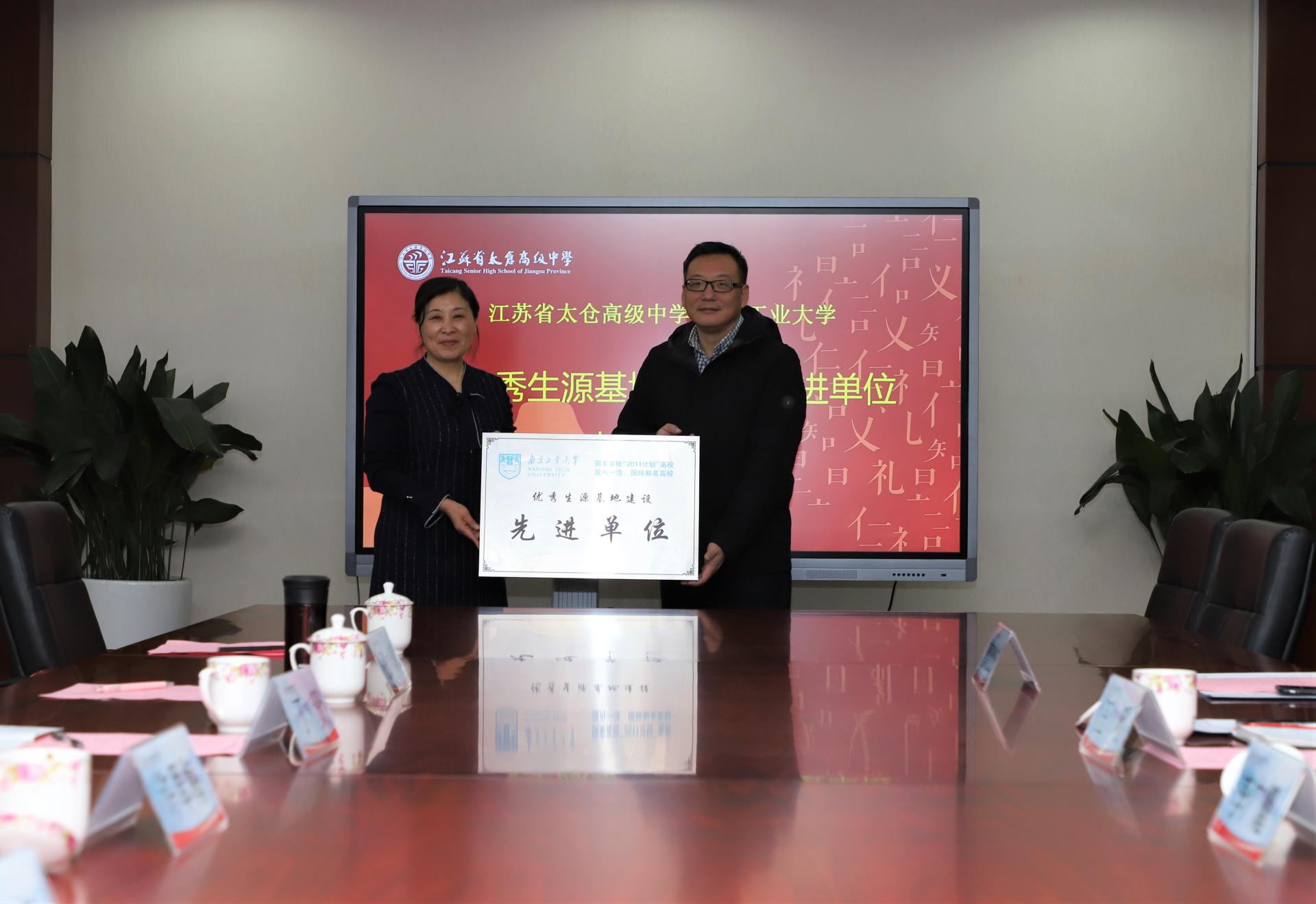 1月9日,我校在江苏省太仓高级中学举行“优秀生源基地建设先进单位”授牌仪式。江苏省太仓高级中学校长李广耀,党总支书记偶伟国,副校长王明等,我校党委学生工作部、学生事务部副部长许翠梅,土木工程学院党委副书记丁贤,招生办公室副主任季青春以及土木工程学院招生宣传组老师出席仪式。