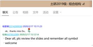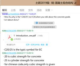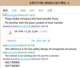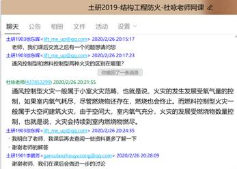 在研究生授课方面,学院及时组织专业课程的授课教师做好本学期研究生课程的线上教学工作,目前本学期全部专业课程在线教学准备工作已完成。我院杜咏教授本学期承担了土研2019级英文授课课程《结防抗火设计理论》和《组合结构》。杜老师提前搭建了在线授课平台,通过分屏语音系统,用在线群研讨、留言的方式与同学们互动交流,来自全国各地乃至身在国外的留学生,通过任课老师发布的屏幕分享平台聚集在一起。研究生们感受到了学院及老师们的牵挂,虽然“宅家”,但距离却仿佛更近了,网课上的同学到课准时,且比课堂教学互动更为踊跃,授课结束时,纷纷给老师点赞;课后,老师及时分享课件资料,勤学好问的同学还积极与老师在线沟通。在线授课质量达到了既定教学效果。