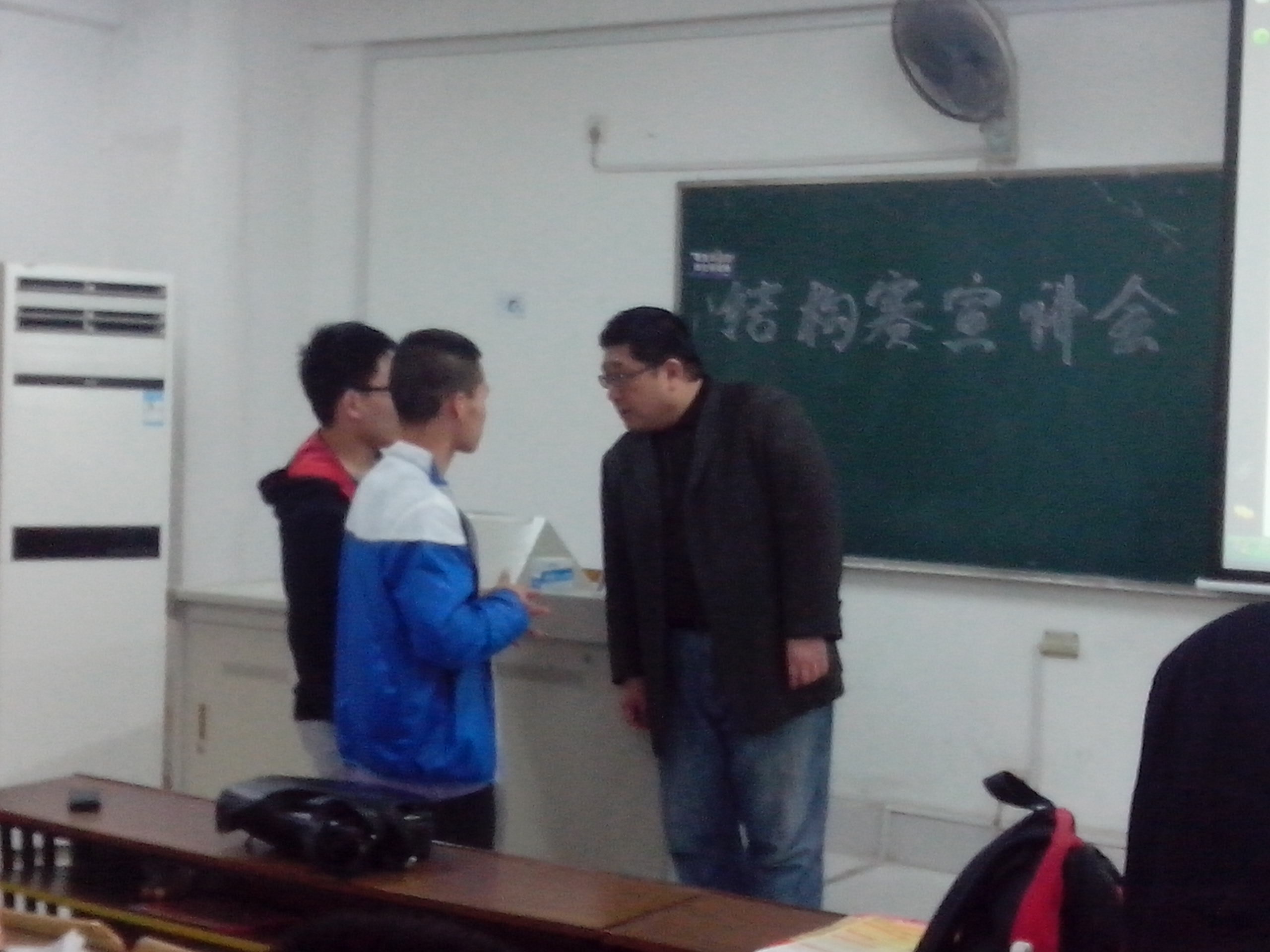 2014年4月9日下午18:00,第十一届华东地区高校结构设计邀请赛校内选拔赛宣讲会在仁智楼225举行。土木学院万里老师、徐迅老师、学生代表及科协成员等参加了会议。