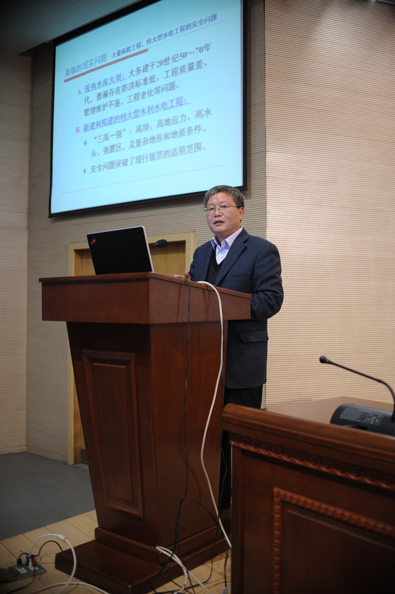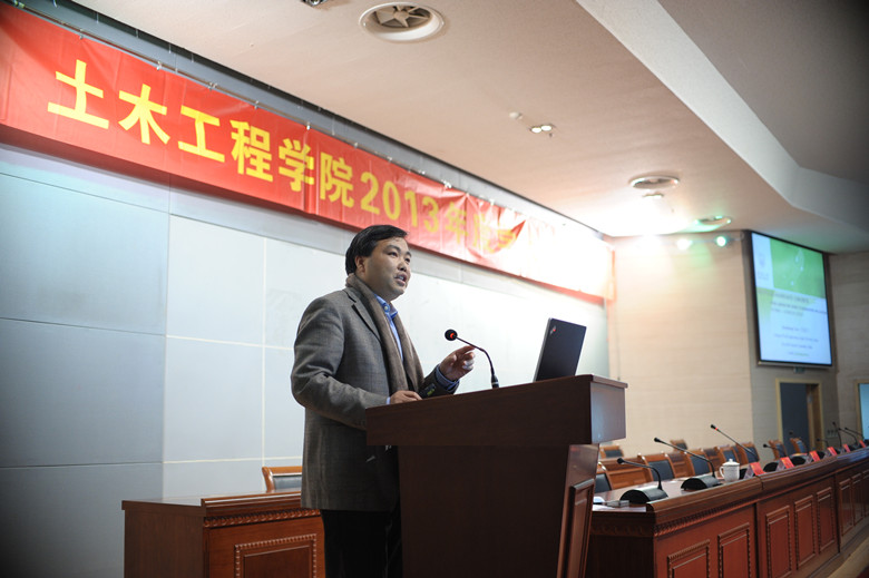 土木工程学院院长董军教授首先致欢迎辞。他代表学院对各位专家的到来表示欢迎,对各位专家长期以来对我院工作的支持和帮助表示感谢,并简要总结了我院2013年的科研工作以及学院实行年度报告会制度的基本情况。孙伟民教授随后发言,孙教授肯定了土木学院科学报告会制度和近几年的科研成果,并希望在新阶段、新挑战、新机遇下,学院能够更进一步深化改革,取得更好的业绩。河海大学水利水电学院院长顾冲时教授代表受邀嘉宾发言。顾教授对土木学院近几年的科研工作的进展和所取得的成果表示祝贺,希望能进一步加强两院的在科研工作上的合作,共同发展。