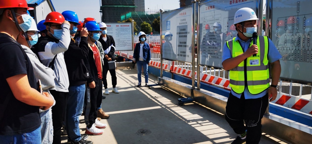 3月26日,同学们来到由中国建筑一局(集团)有限公司负责建设的南京云商乐数码科技有限公司总部基地项目现场,该项目位于南京市江北新区,总建筑面积49436.83平方米,地下2层,地上20层,采用框架-核心筒结构体系,目前正处于基础连续墙施工阶段。在项目负责人的带领下,同学们系统地了解了工程的基本概况、平面布置、组织机构、安全生产管理制度等,通过与施工负责人面对面交流,积极提出问题进行讨论,强化了专业理论,激发了学习兴趣。