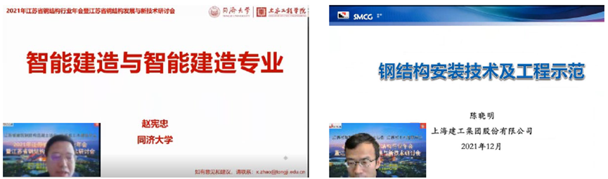 舒赣平副主任委员主持了上午第二阶段的专家报告。同济大学赵宪忠教授做了题为“智能建造与智能建造专业”的报告,从智能建造技术和学科发展、同济大学智能建造本科专业建设进展两大方面全面解析了智能建造的核心内涵和发展趋势。上海建工集团陈晓明总工做了题为“钢结构安装技术及工程应用”的报告,从五个方面介绍了钢结构安装技术和上海建工集团在一列重大工程的应用实践。曹平周常务副会长做了题为“同心协力 提质增效 打造“江苏建造”品牌”的报告,全面总结了江苏省建筑钢结构混凝土协会钢结构分会2021年度的工作。