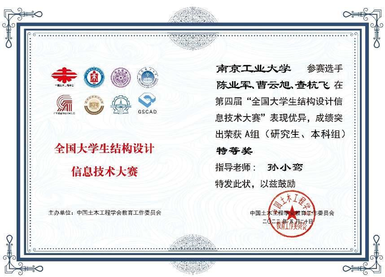 近日,第四届“全国大学生结构设计信息技术大赛”成绩公布,土木工程学院孙小鸾老师指导的陈业军、曹云旭、查杭飞小组荣获A组特等奖。