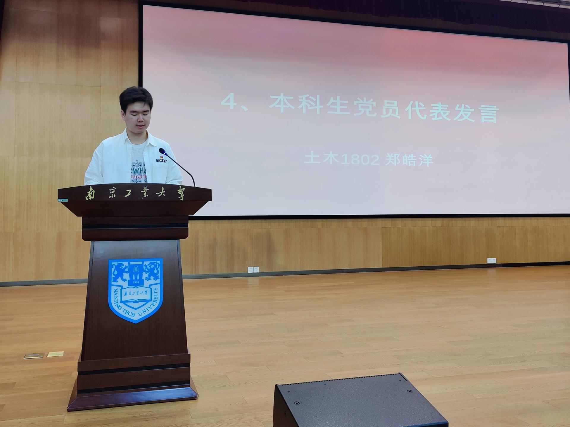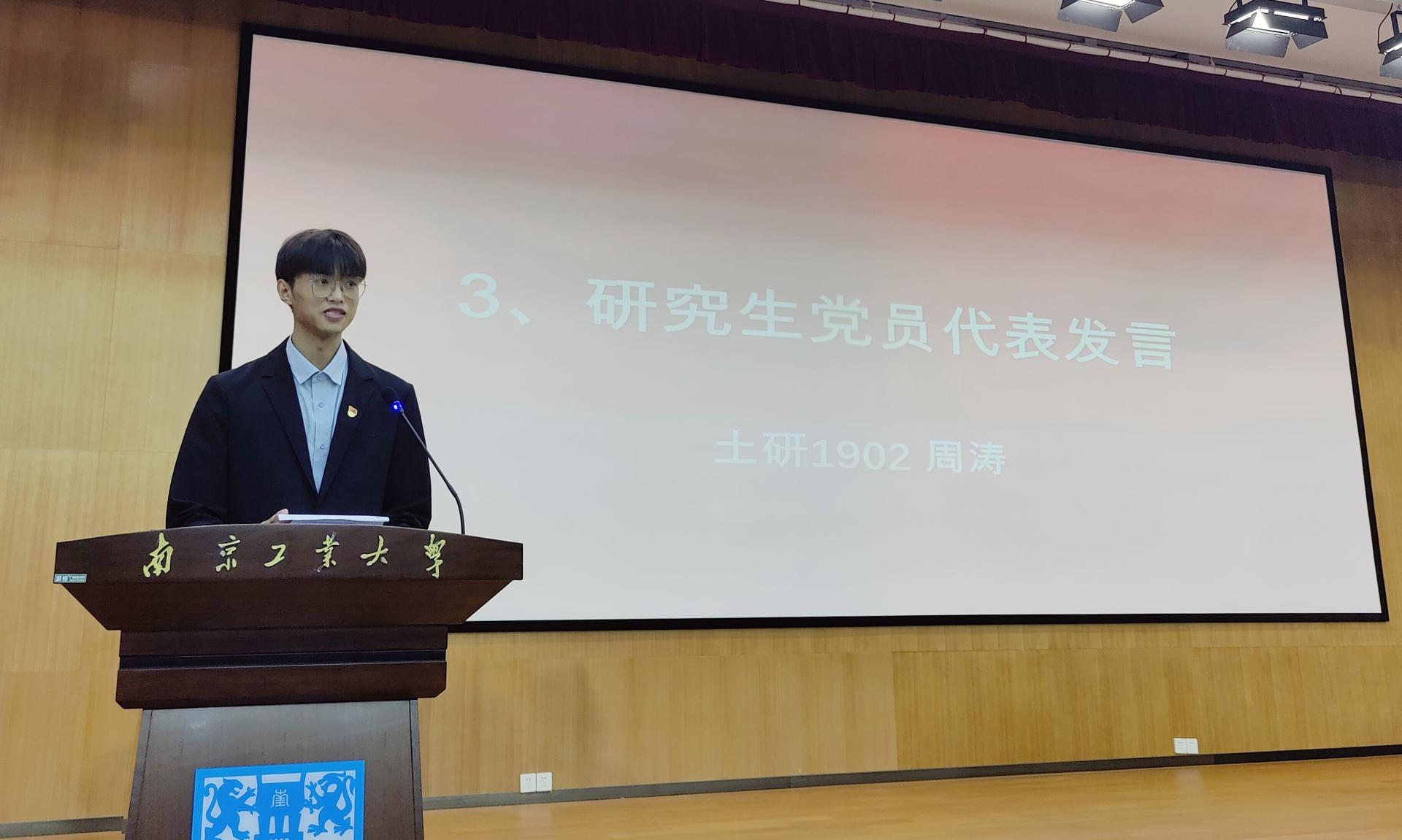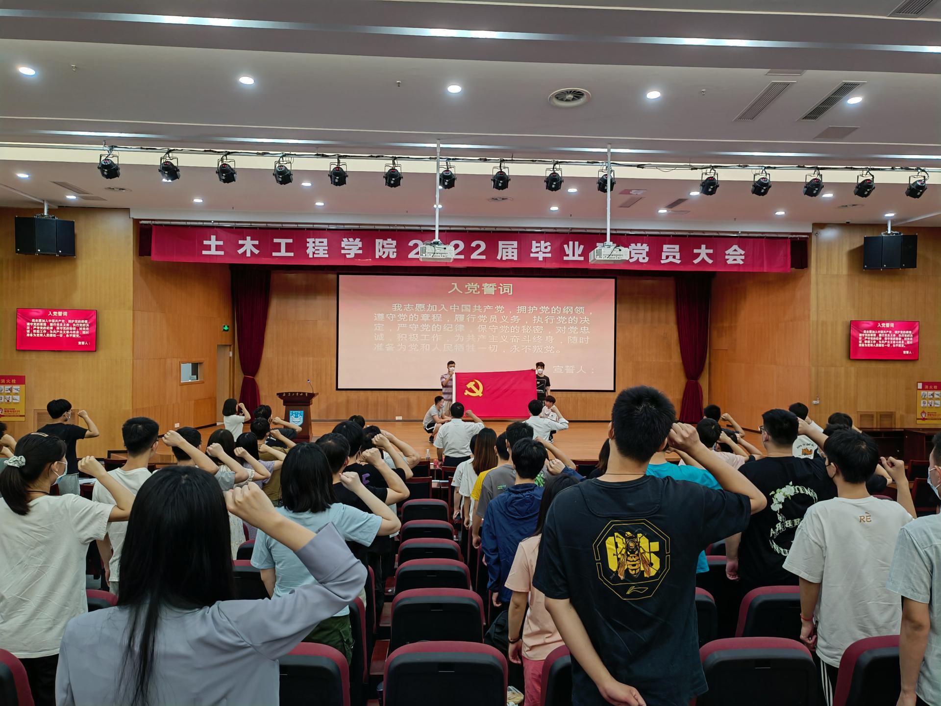 大会在庄严的国歌声中拉开序幕。会议伊始,谢璐璐老师为毕业班党员介绍党组织关系转接的相关事宜。毕业班党员代表土研1902班周涛、土木1802班郑皓洋分别发言,表示在今后工作和学习中会继续发挥党员先锋模范作用,与时代同行,为母校争光。往届党员校友代表,中建八局三公司科技质量部副经理徐晓辉、中建五局华东公司项目书记汤太慧、中建六局土木公司项目经理沙学强,通过视频的方式寄语广大党员同学,不忘初心,砥砺前行,切实肩负起青年学子的使命和担当。随后,游艺林老师带领全体党员重温了入党誓词。