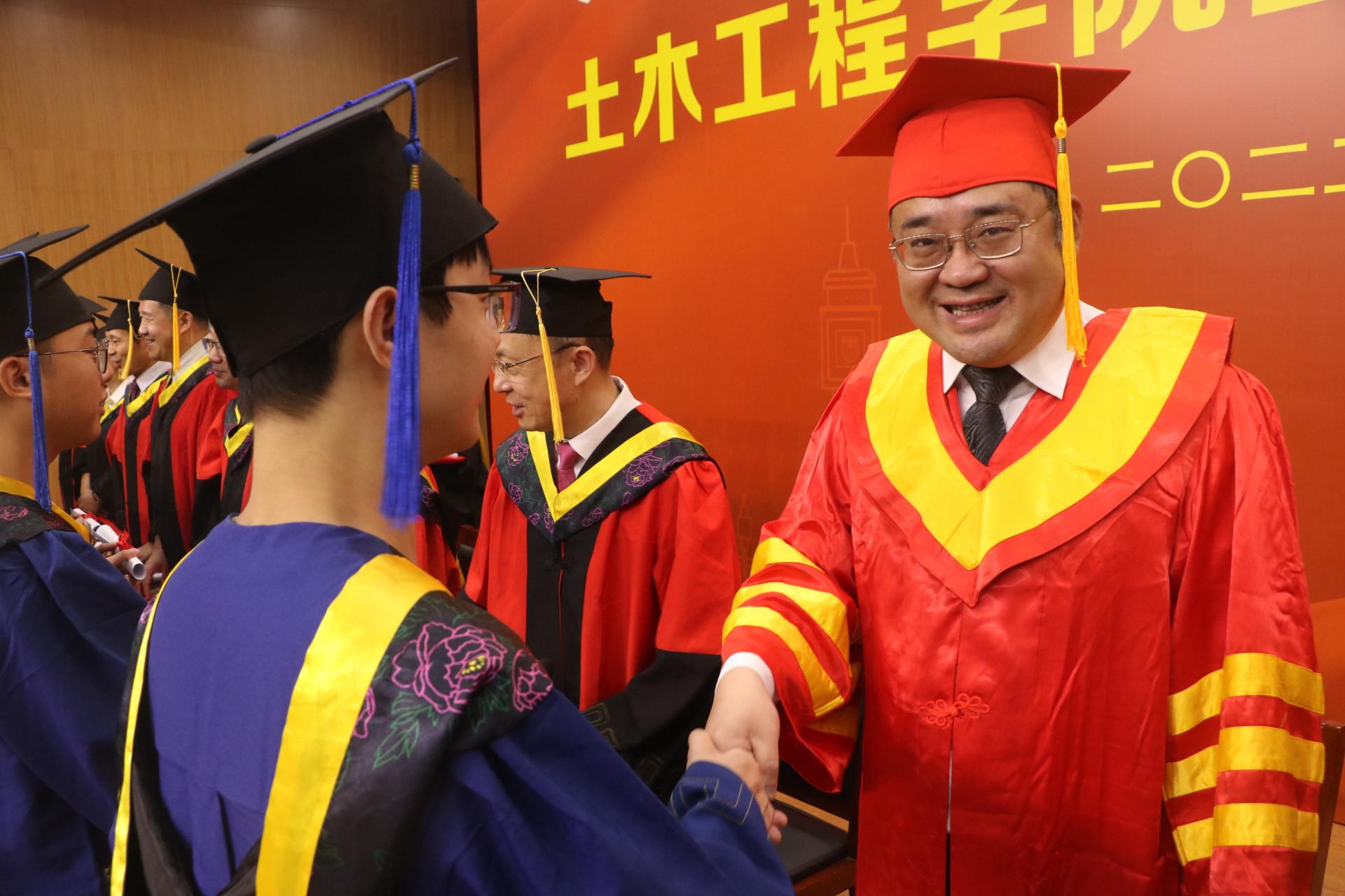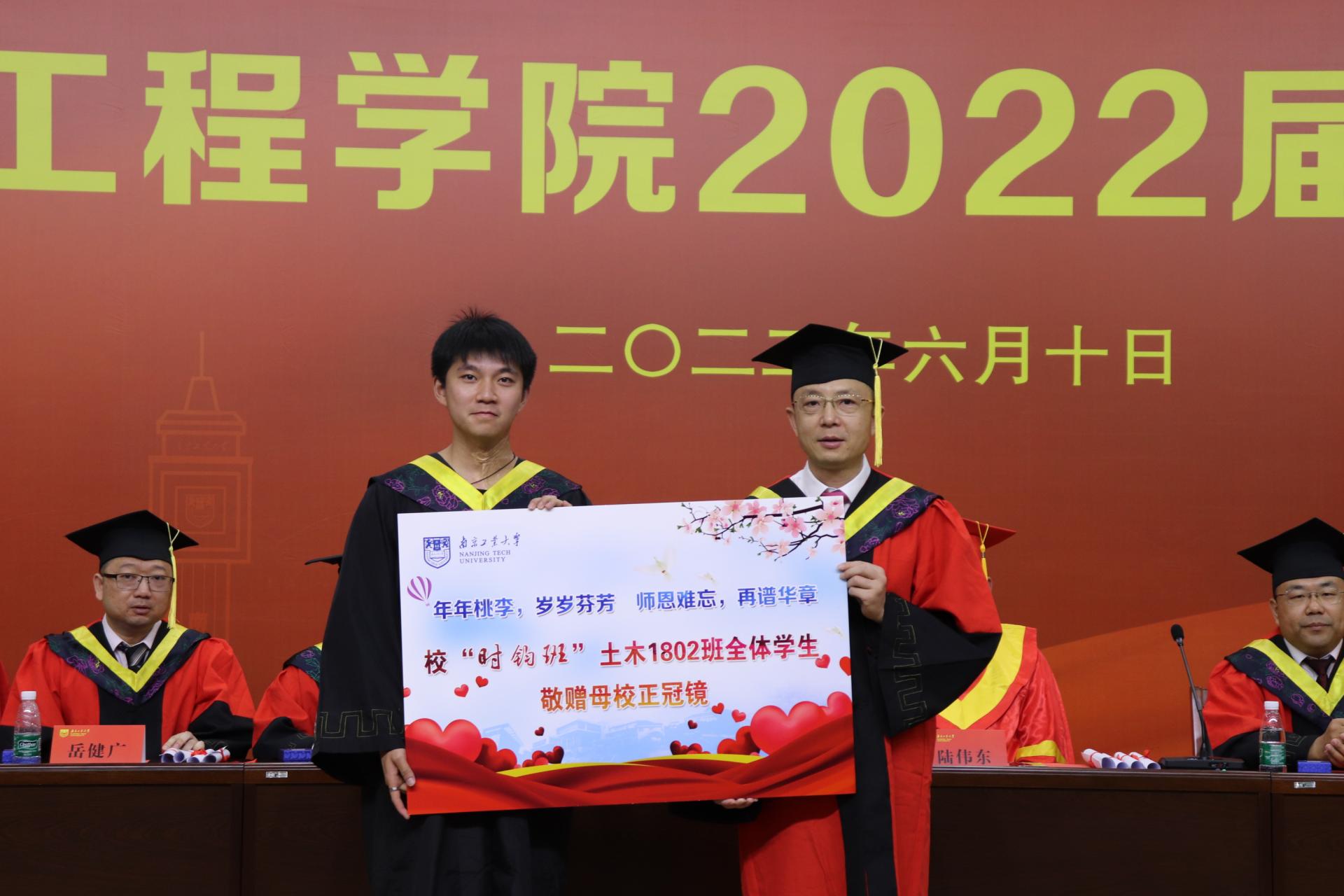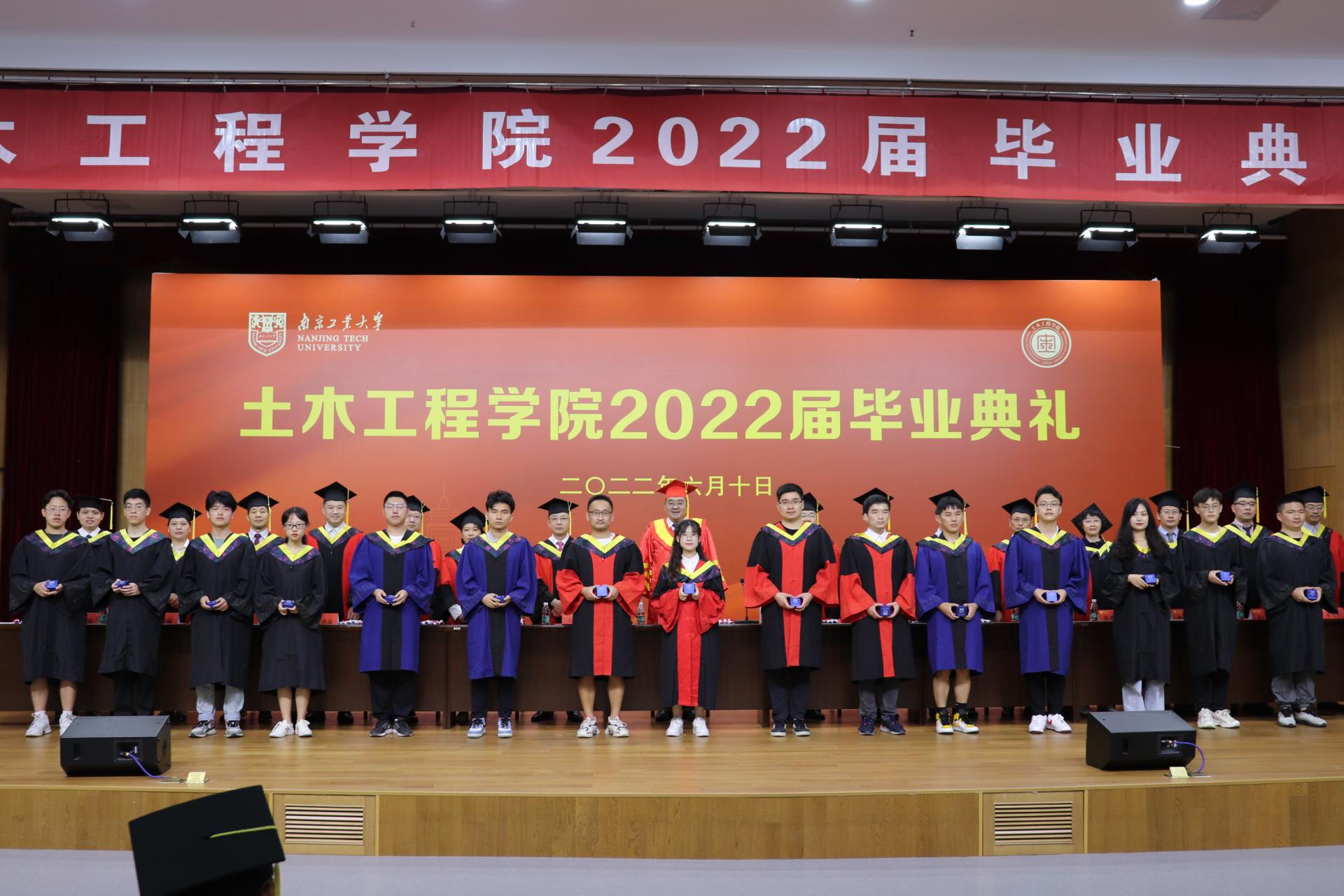 毕业典礼伊始,全场奏唱国歌。院党委书记张涛宣读优秀毕业生推荐名单;院长王曙光宣读“中铁建工”就业工作专项奖学金表彰决定;本科毕业生代表土木1805刘明龙同学、研究生毕业生代表土博1801张婧同学分别发言,分享了自己在校期间的学习生活感悟,感谢学校、学院和师长的谆谆教诲。教师代表徐金俊在发言中表示,希望毕业生勿弃家国情怀,练就天下格局;打磨生存本领,学会筑巢引凤。随后,土木1802班向学院捐赠正冠镜,学院向2022届毕业生代表赠送纪念戒指,毕业生代表朗诵《到祖国需要的地方书写热血青春》。在欢快的音乐声中,在主席台就坐的师长们为毕业生代表授予学位并拨穗。