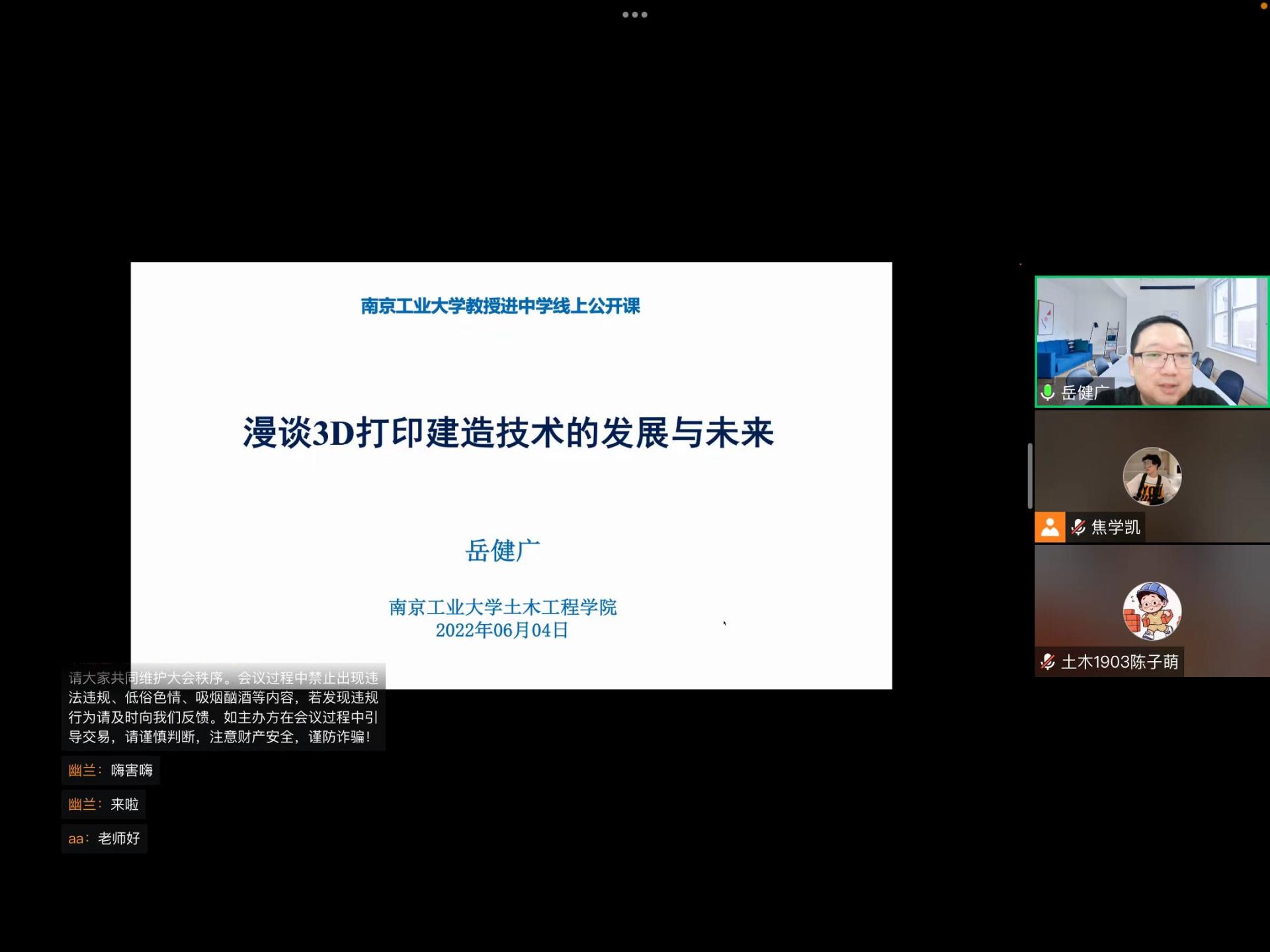 “教授进中学”线上公开课由学院副院长方海教授、岳健广教授和智能建造与管理系系主任齐玉军教授担任主讲,分别围绕“双碳”背景下可持续土木工程的发展、3D打印技术的发展与未来、智能建造与BIM应用展开。三位教授结合行业前沿,语言生动有趣,内容深入浅出,极大地激发了高中学子的学习热情和对我校的报考兴趣。公开课以线上直播的形式输送至中学及考生,各招生宣传组负责联络基地中学学生线上下观看,教授们在线与考生互动交流,累计吸引1000余名学生和家长观看。