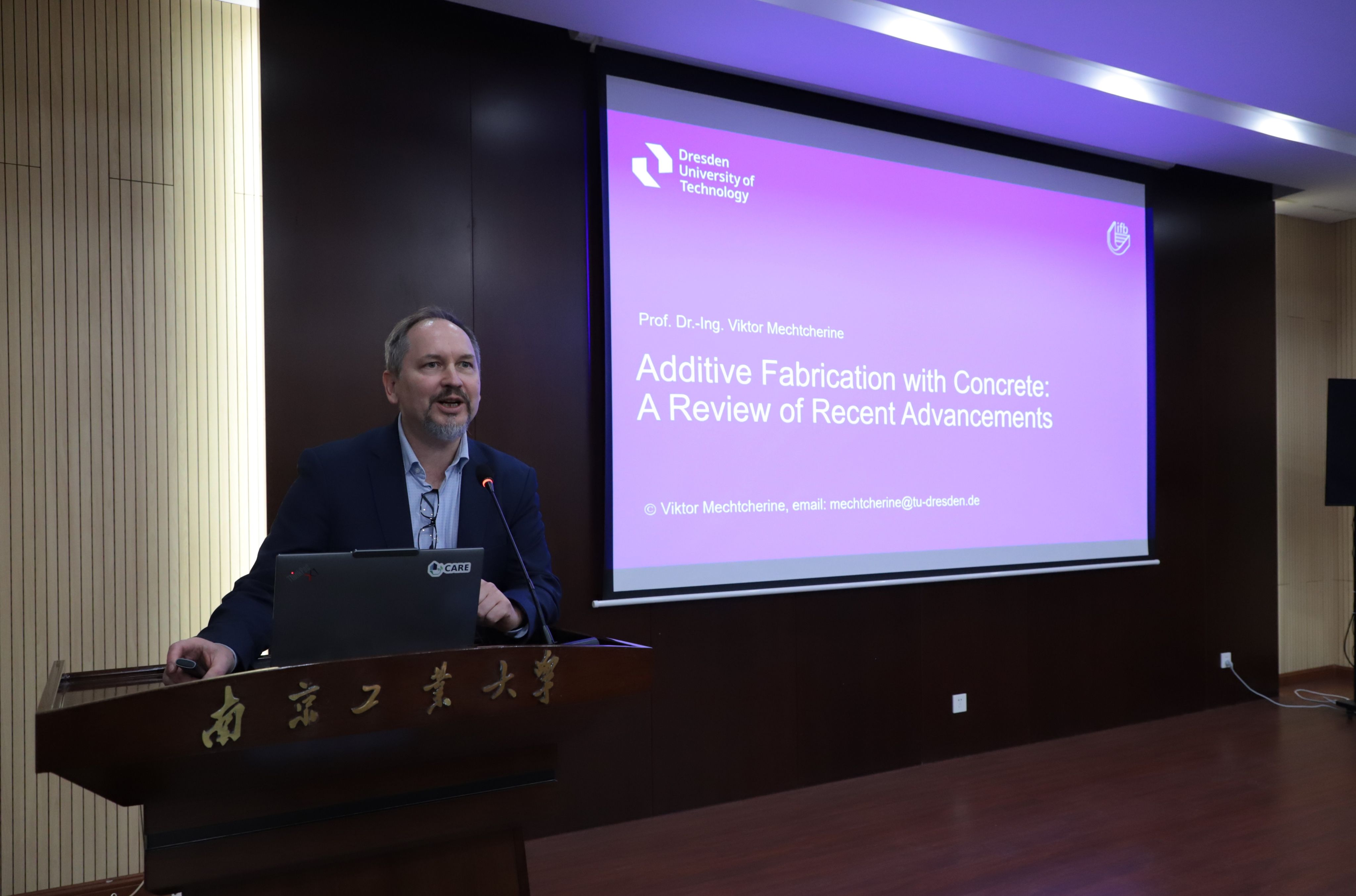 本次活动特邀德国德累斯顿工业大学、德国科学院院士Viktor Mechtcherine教授作主旨报告,他围绕3D打印混凝土技术,深入阐述了计算机技术与建筑材料学科的前沿交叉与协同创新。报告结束后,在土木学院院长方海的陪同下,Viktor Mechtcherine教授参观了学院复合材料结构实验室,双方围绕实验室平台建设、科研项目及技术创新进行了深入交流。