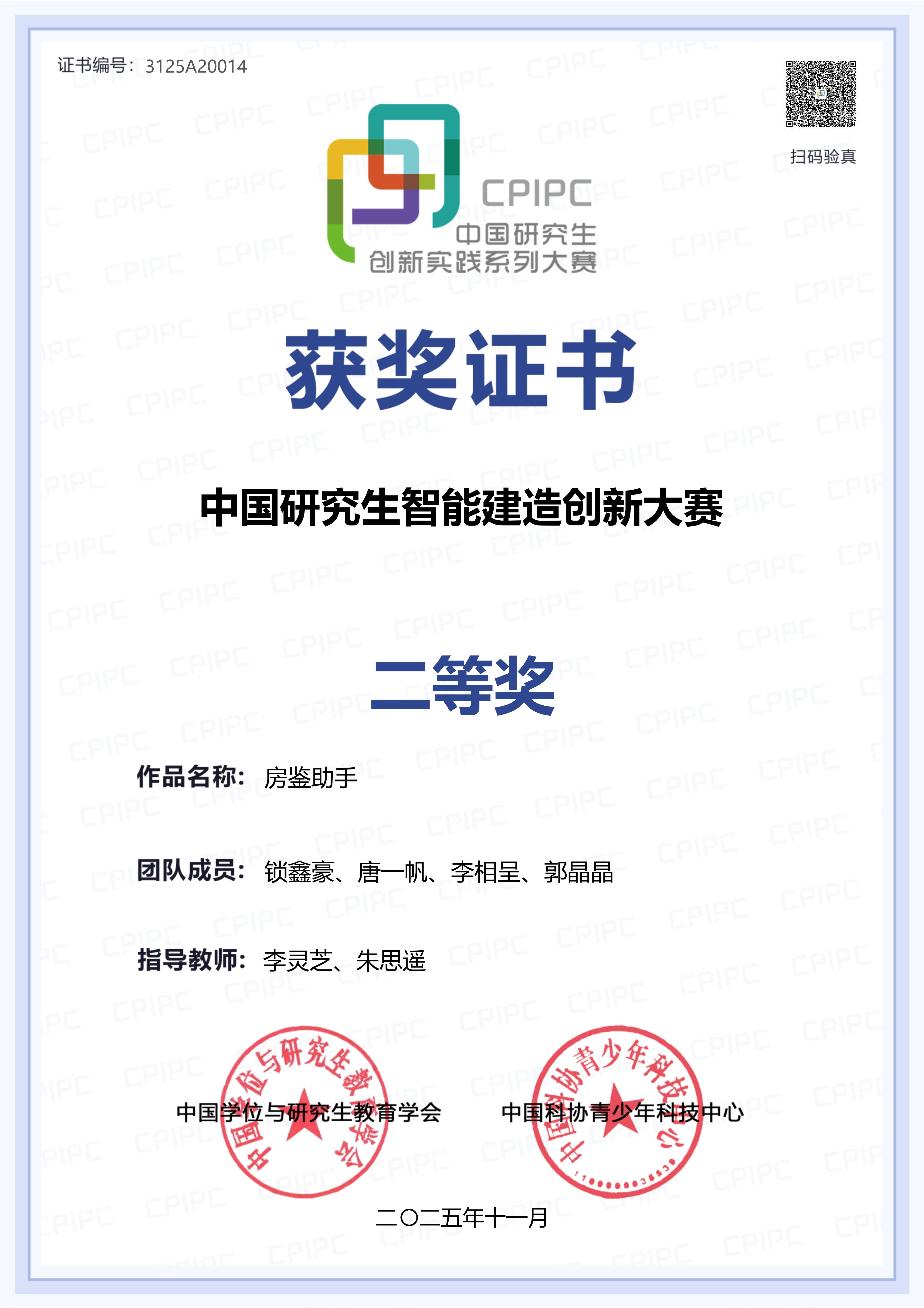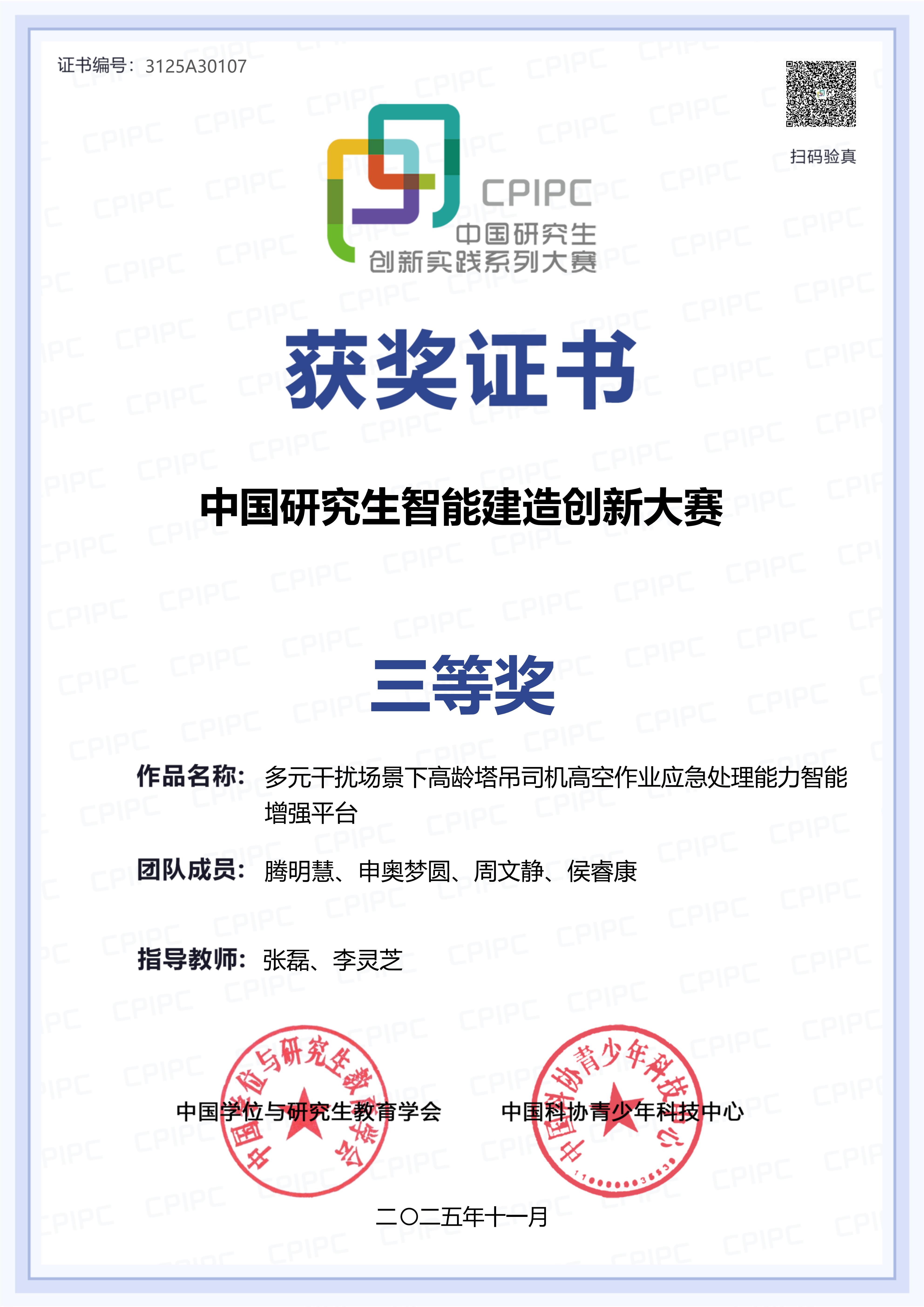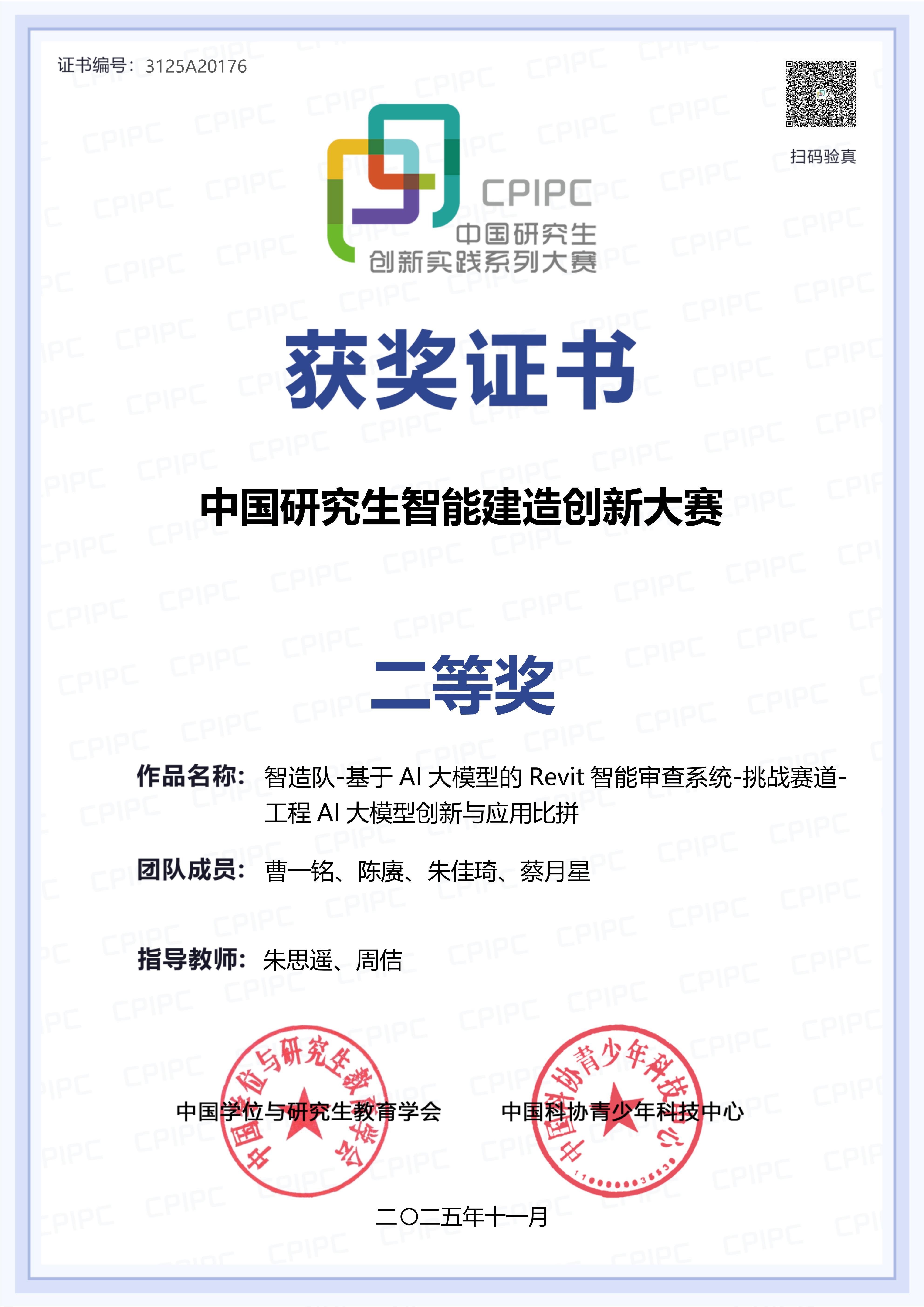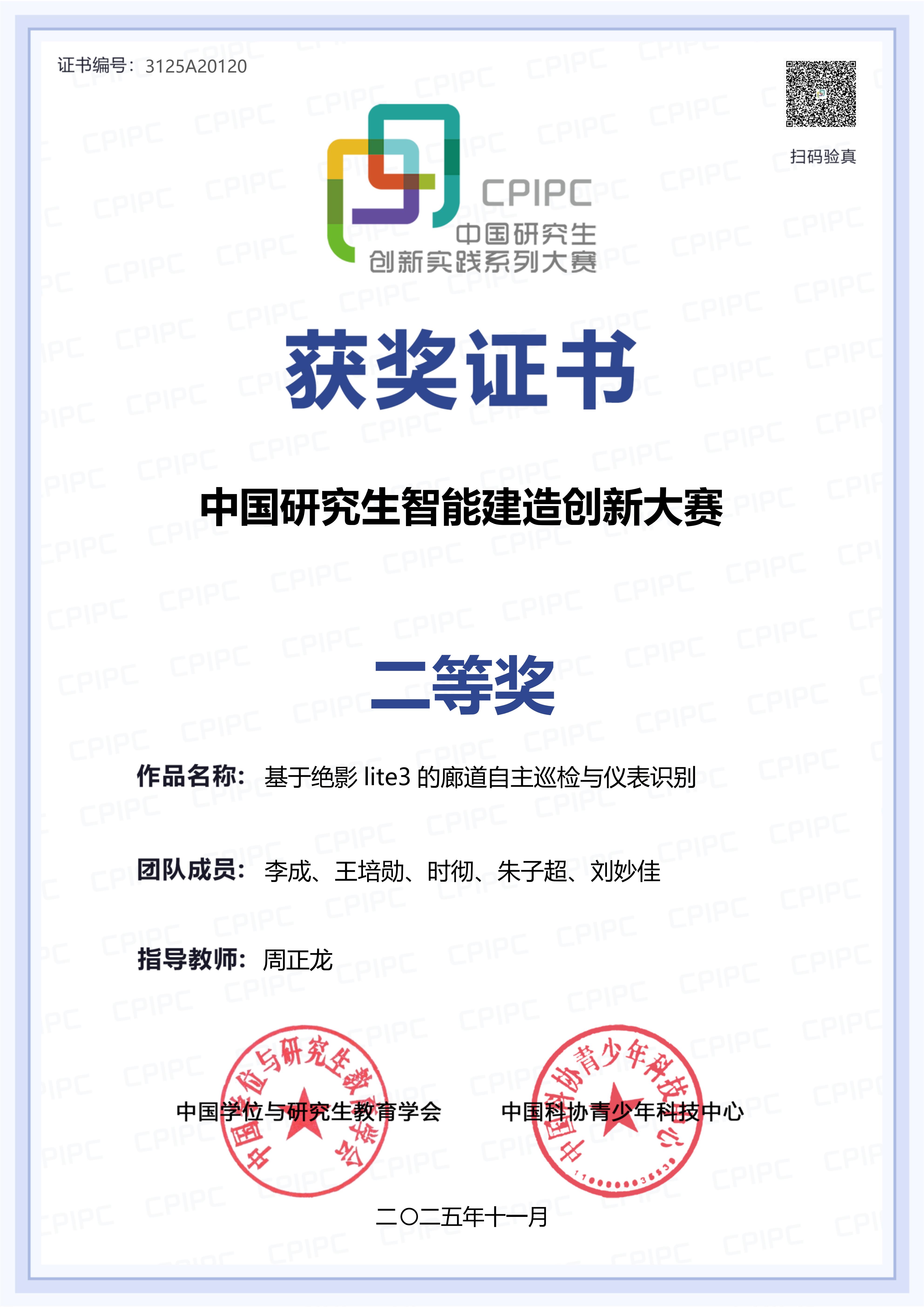作为中国研究生创新实践系列大赛的重要主题赛事,本届大赛紧密围绕智能建造学科前沿,深度聚焦行业工程实践痛点与产业发展需求,着力提升研究生的创新思维、数智融合与实践应用能力,赛事吸引了全国225所高校的1316支团队踊跃参与,经过层层选拔,共有336支队伍晋级全国总决赛。自今年5月大赛启动以来,学院高度重视此项赛事,积极组织动员,并为参赛团队提供全程支持与保障。经全国初赛评审,我院共有3支队伍脱颖而出,成功晋级总决赛。在决赛阶段的激烈角逐中,由李灵芝、朱思遥、周佶老师共同指导的2支团队在“挑战赛道-工程AI大模型创新与应用比拼”中双双斩获全国二等奖;由周正龙老师指导的团队在“挑战赛道-大坝廊道仪表定位及数据读取比拼”中荣获全国二等奖;此外,由张磊老师指导的团队在“常规赛道-创意创新类”中荣获全国三等奖。这些获奖项目紧扣行业实际需求,内容扎实、创新性强,充分彰显了我院学子在智能建造领域融合数字技术、解决复杂工程问题的综合能力。