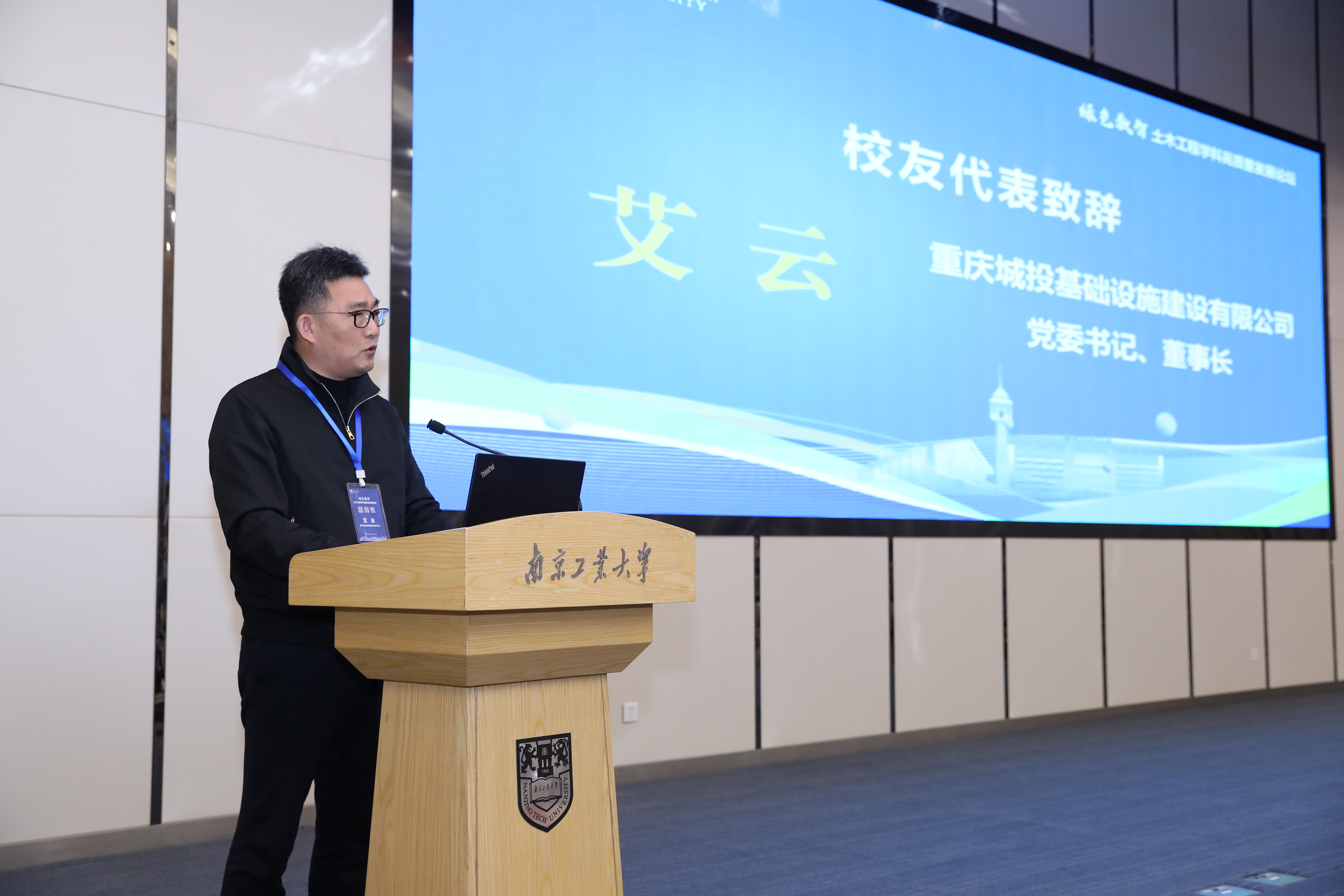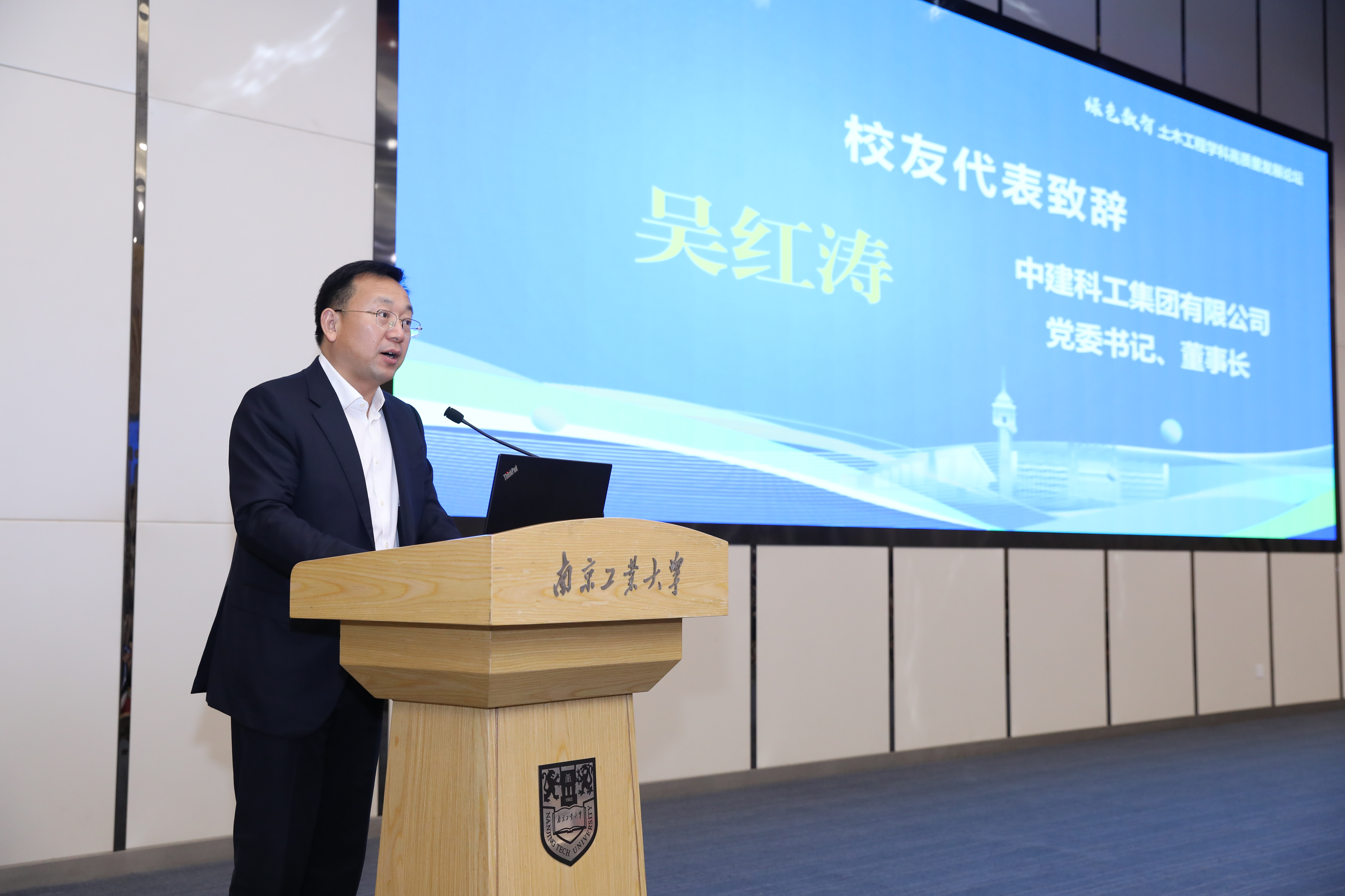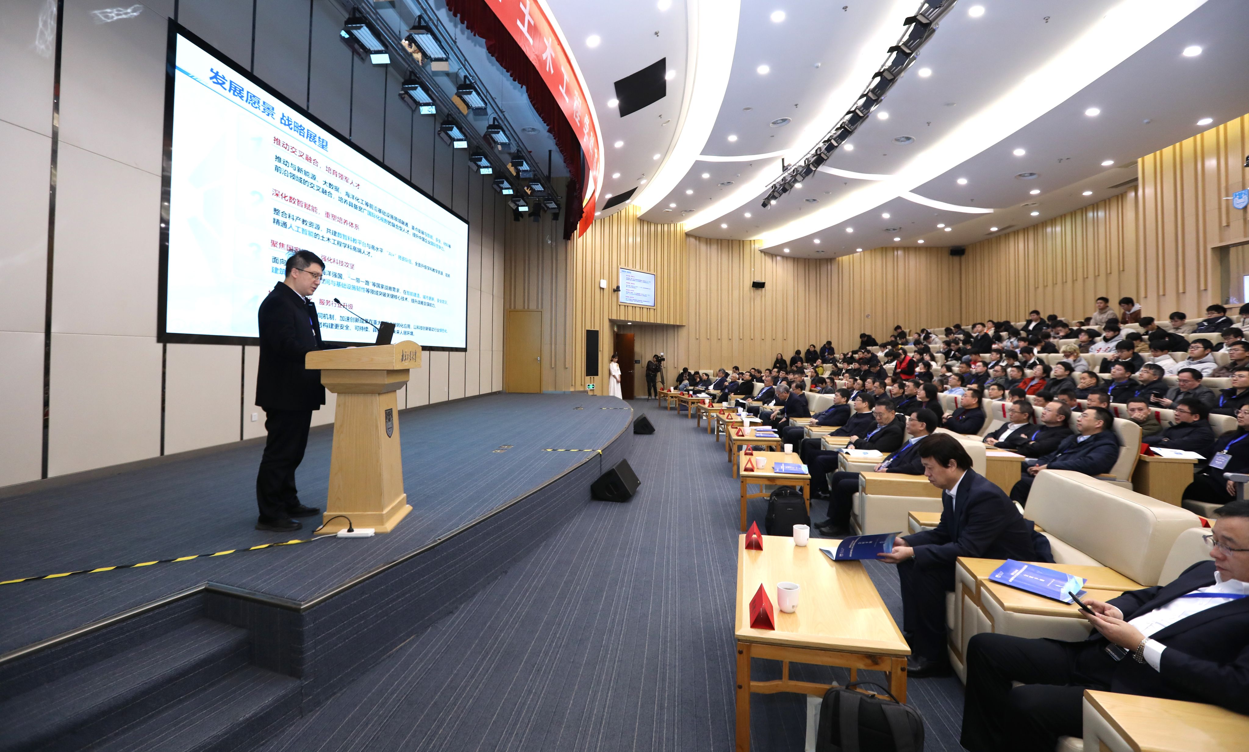 党委书记荆晅在致辞中回顾了学科百十年历程与贡献,强调面对绿色化、数智化行业变革,学科需聚焦服务国家战略全局、以“人工智能+”引领行业转型、深化跨领域协同融合三大方向,携手各界共谱高质量发展新篇章,为强国建设贡献土木力量。