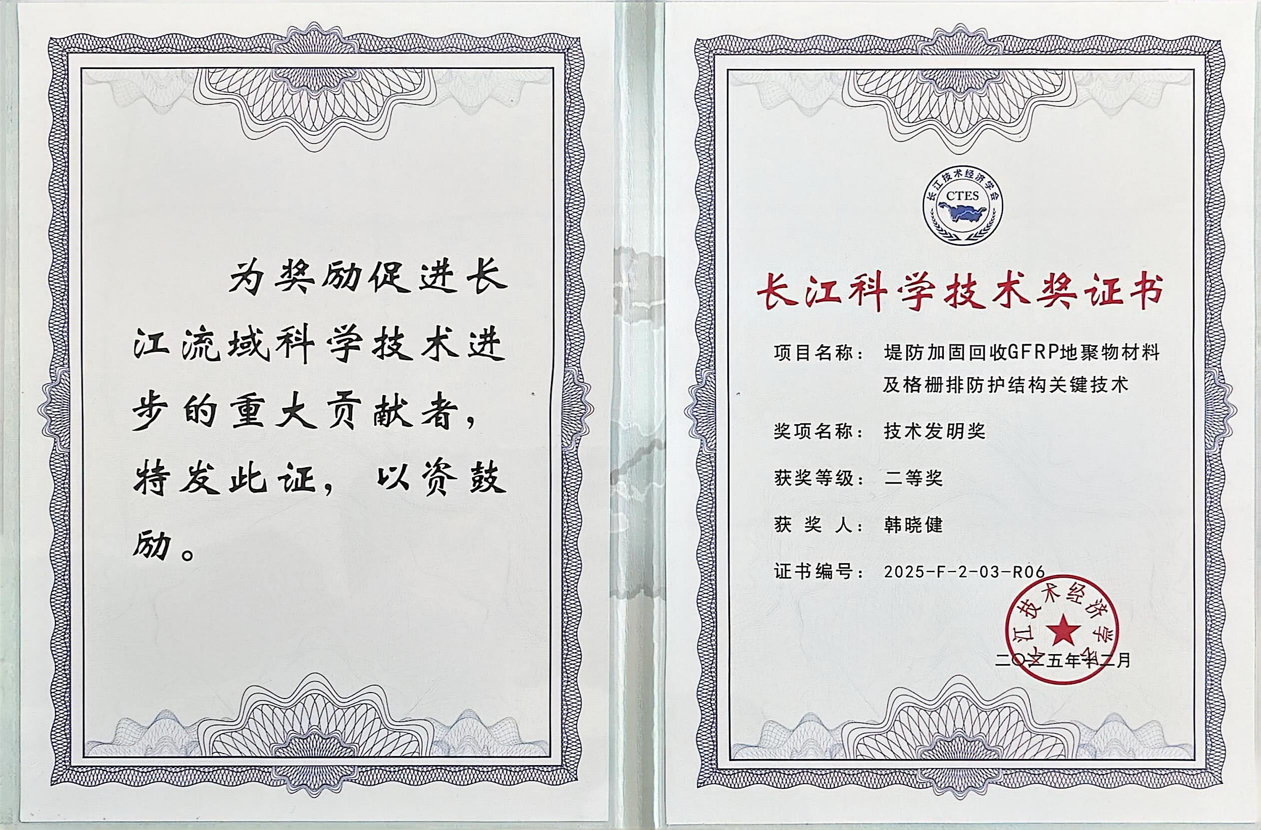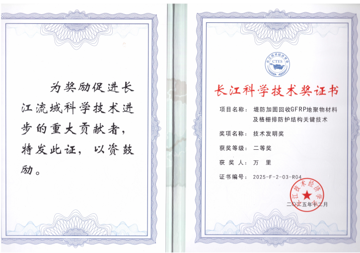 2025年12月27日,长江技术经济学会、长江治理与保护科技创新联盟2025年学术年会在武汉隆重召开。来自全国近500名专家学者、科研机构代表、高校及企事业单位代表齐聚江城,共商长江大保护与高质量发展大计。会上举行了2025年度长江科学技术奖颁奖典礼,我院教师王俊(第二完成人)、万里(第四完成人)、韩晓健(第六完成人)作为主要完成人参与研发的“堤防加固回收GFRP地聚物材料及格栅排防护结构关键技术”成果,荣获本年度长江科学技术奖技术发明二等奖。万里教授作为获奖代表之一,代表学校出席了颁奖典礼并上台领奖。