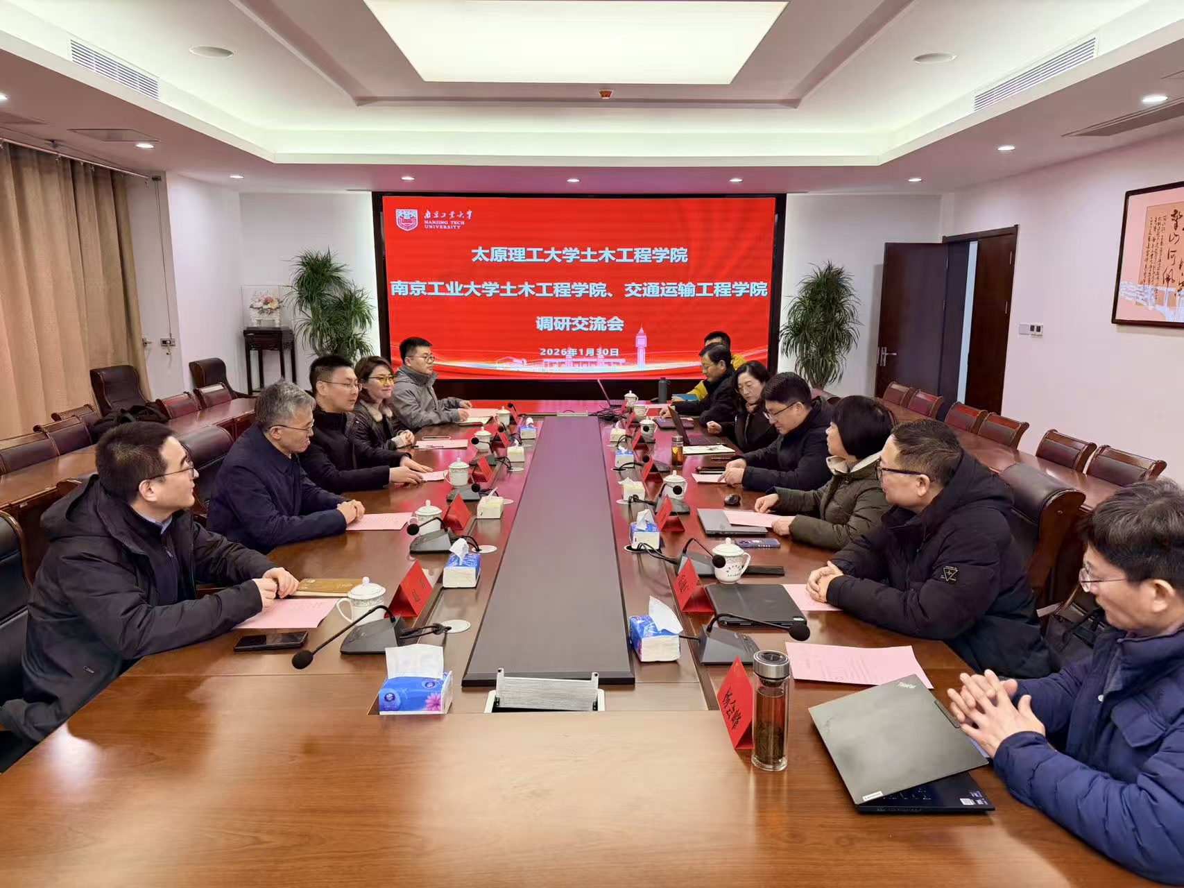 2026年1月30日上午,太原理工大学土木工程学院院长孙逸飞一行到访我校开展调研交流,同行人员包括副院长王蕊、副院长张翛、实验中心负责人苗晨曦、省工程研究中心副主任曦赵晖。我校土木工程学院院长方海及副院长王俊、岳健广、杨会峰,交通运输工程学院副院长高洪梅、吴志坚及实验中心主任吴琪与会交流。会议由副院长王俊主持。
