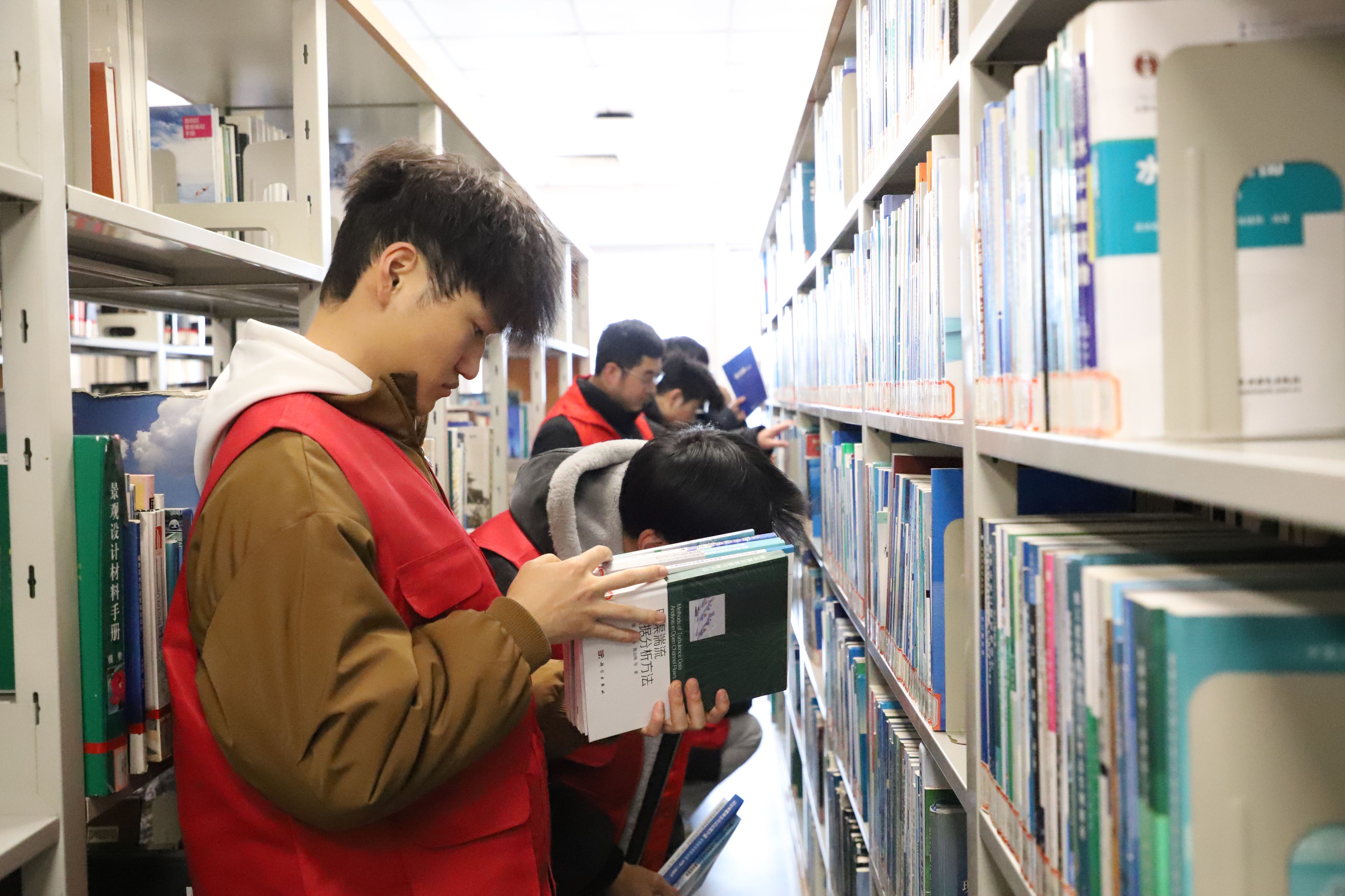 随后,同学们在图书馆工作人员的指导下分组行动。图书整理组的党员们化身 “书籍摆渡人”,仔细核对图书编号,将散落书架的书籍归位上架,让杂乱的书架变得井然有序;文明引导组在阅览区、借阅处主动为读者提供咨询服务,耐心解答借阅流程、馆藏查询等疑问;环境优化组手持清洁工具,对阅览桌椅、书架角落、楼梯扶手等进行全面清扫。各小组各司其职,秉持雷锋 “干一行爱一行、专一行精一行” 的敬业精神,形成一道道亮眼的 “志愿红” 风景线。