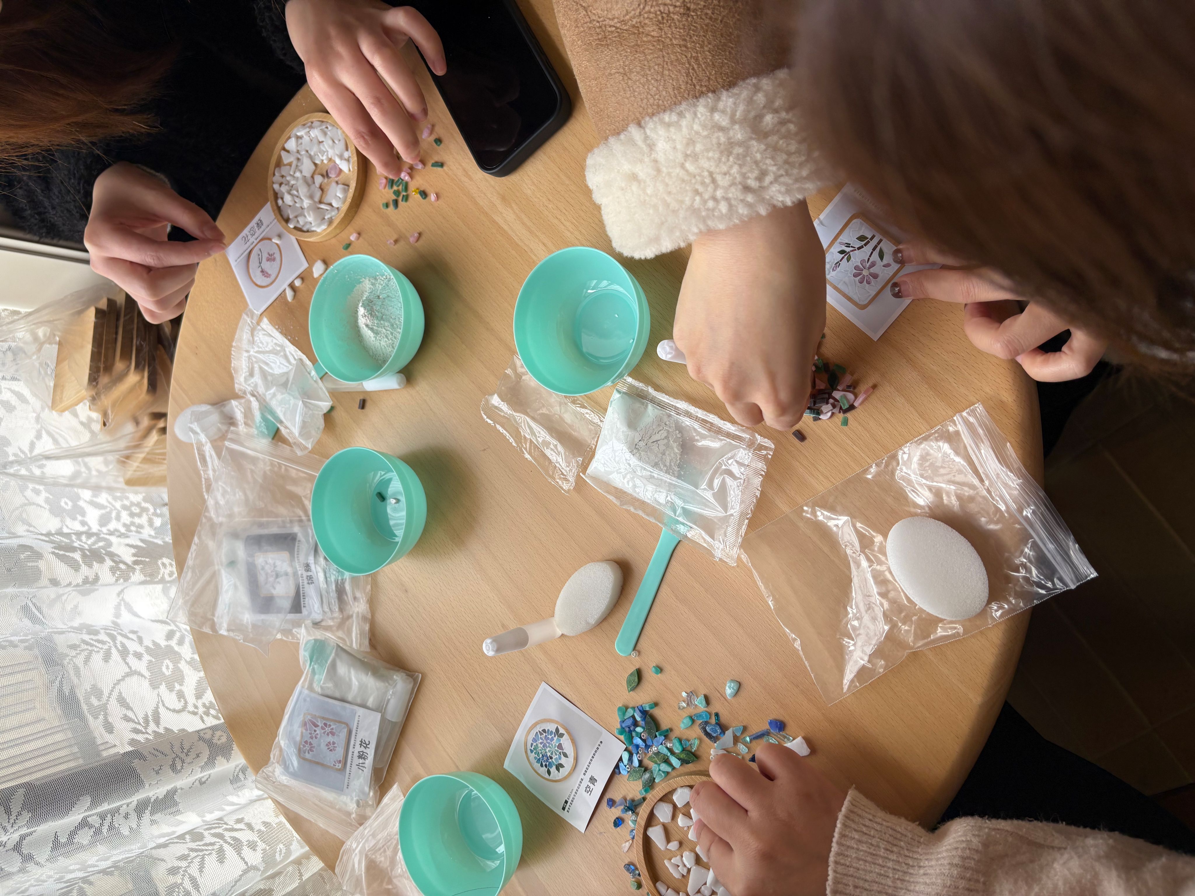 手作环节,老师们用五彩瓷片、贝壳等材料制作创意杯垫。拼贴、填缝、定型,大家发挥各自的审美与巧思,将一件件普通的材料变成独一无二的作品。有老师笑言,这和工程设计一样,既要精细,也要美感。