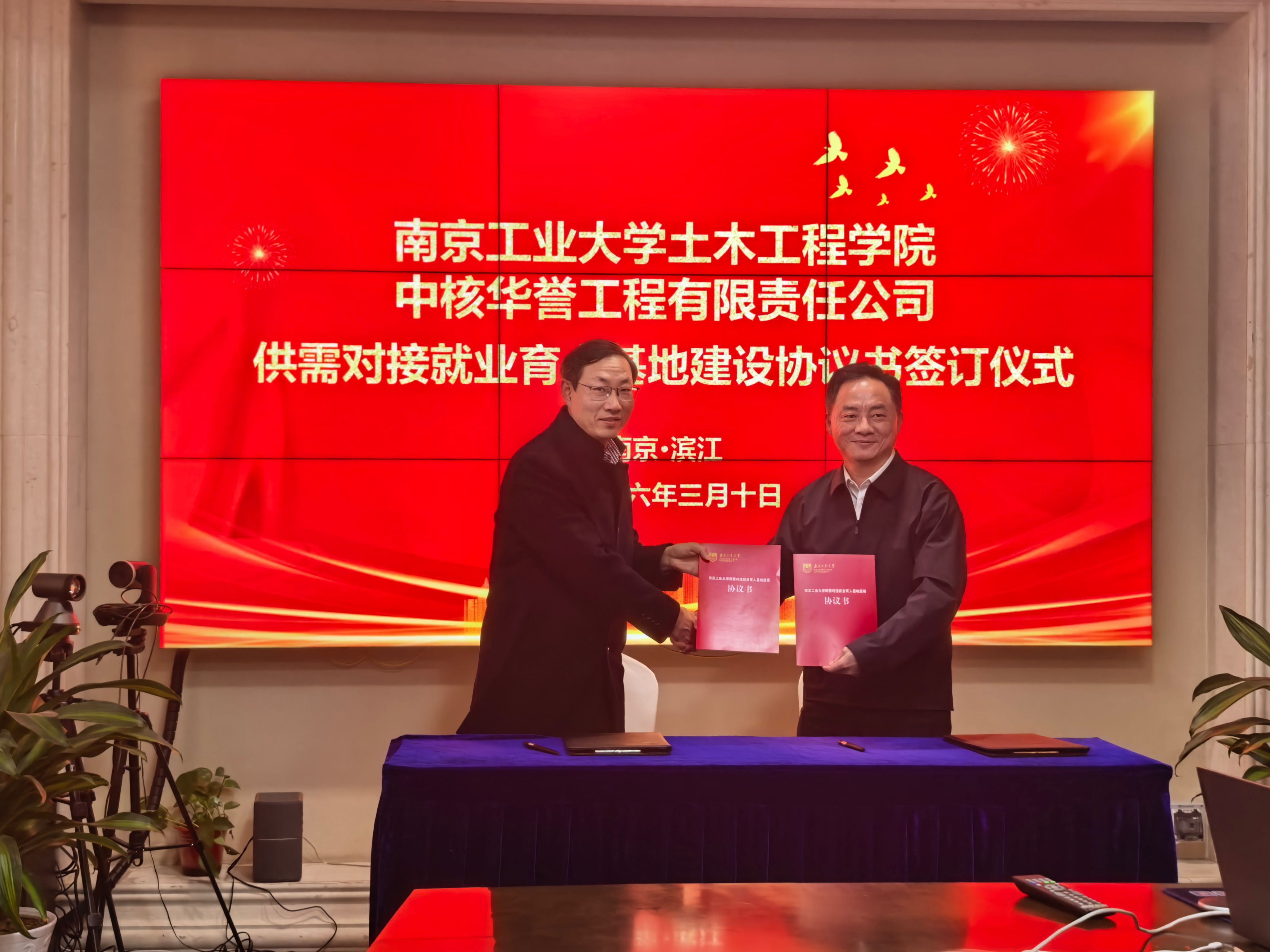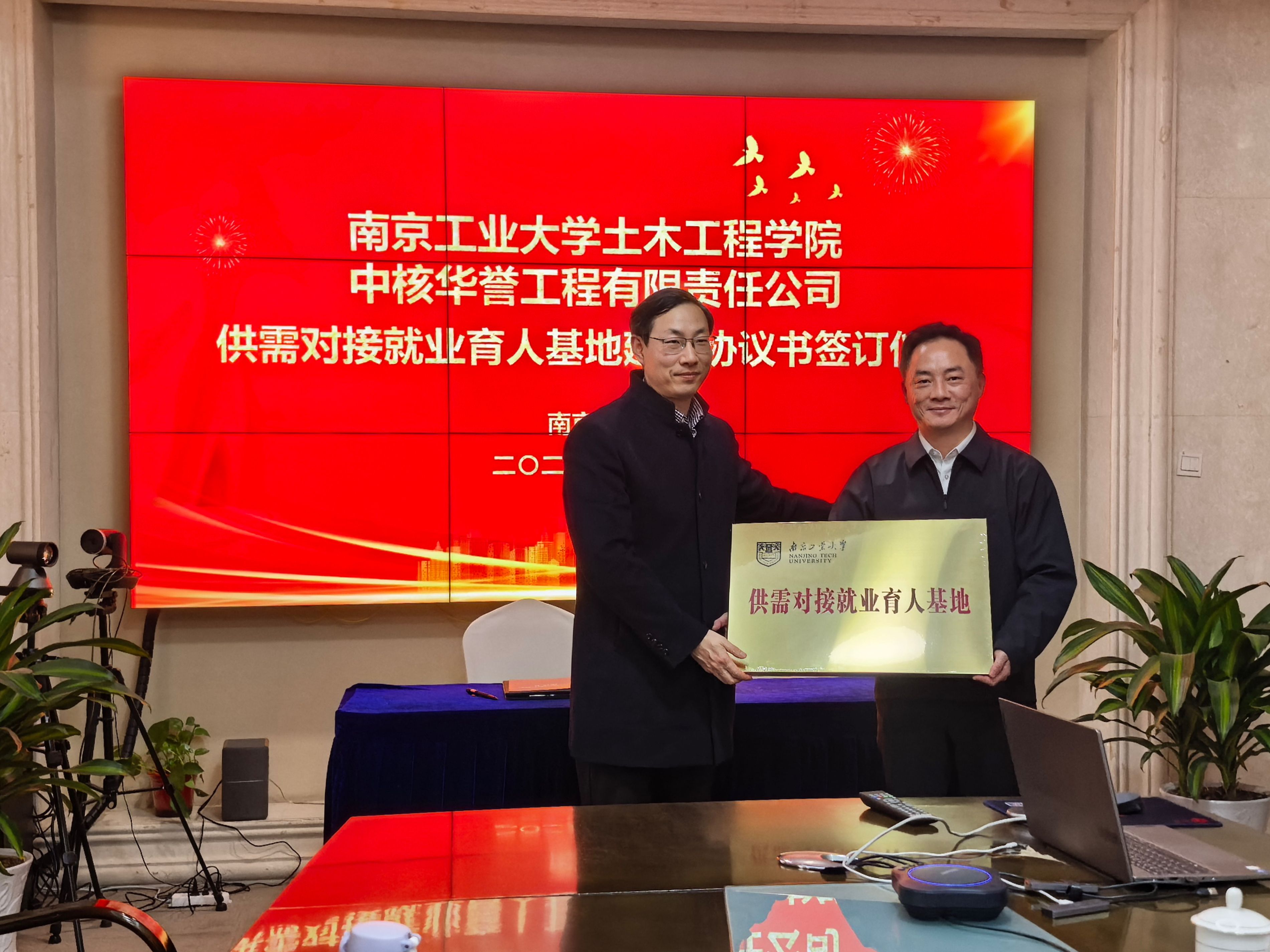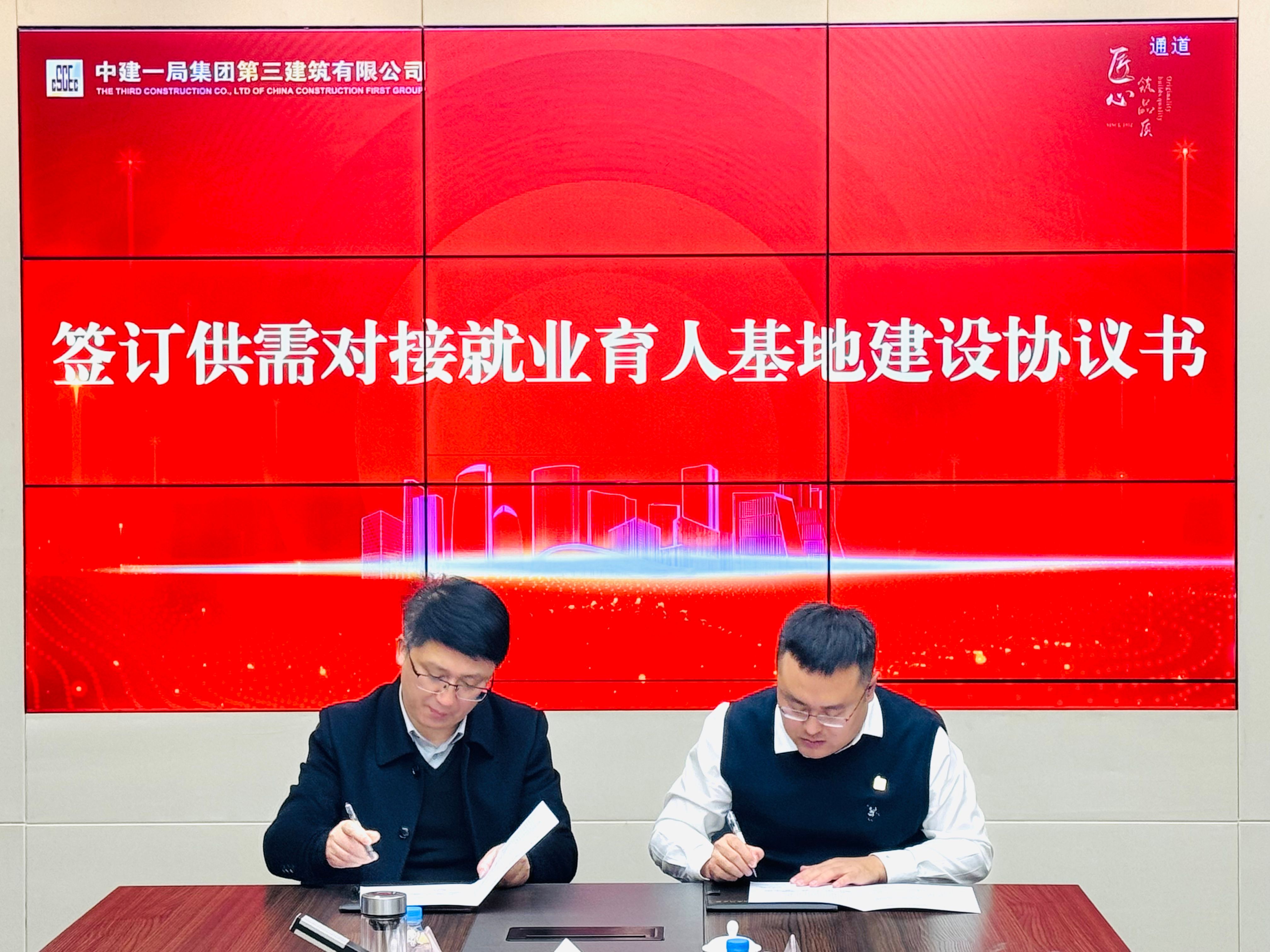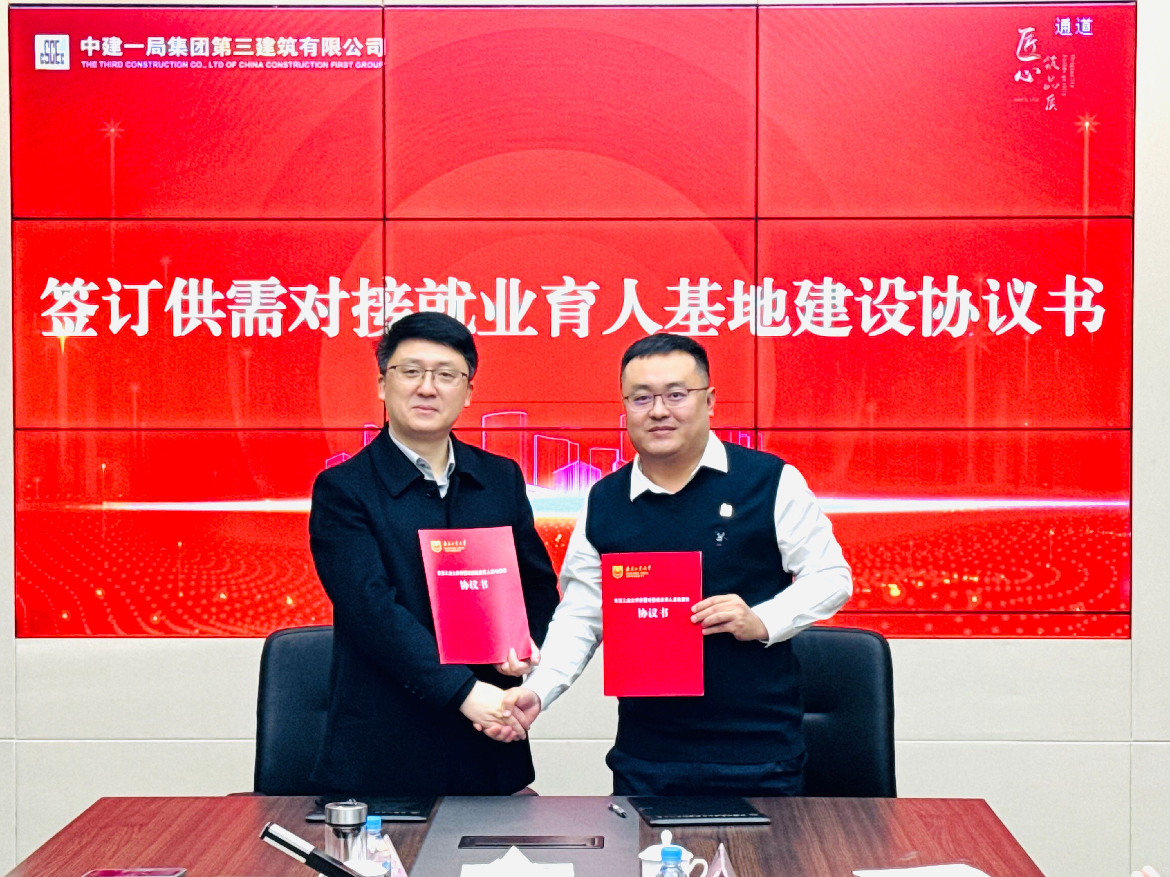 在中建一局三公司,安全总监、南京工业大学1988级校友安戈对学院一行表示热烈欢迎,希望通过此次交流,进一步加强校企合作,实现资源共享和优势互补。人力资源部、干部人事部总经理王小磊介绍了公司概况及未来发展方向。方海介绍了学院发展情况及26届毕业生情况。会上双方签订了供需对接就业育人基地建设协议并授牌。