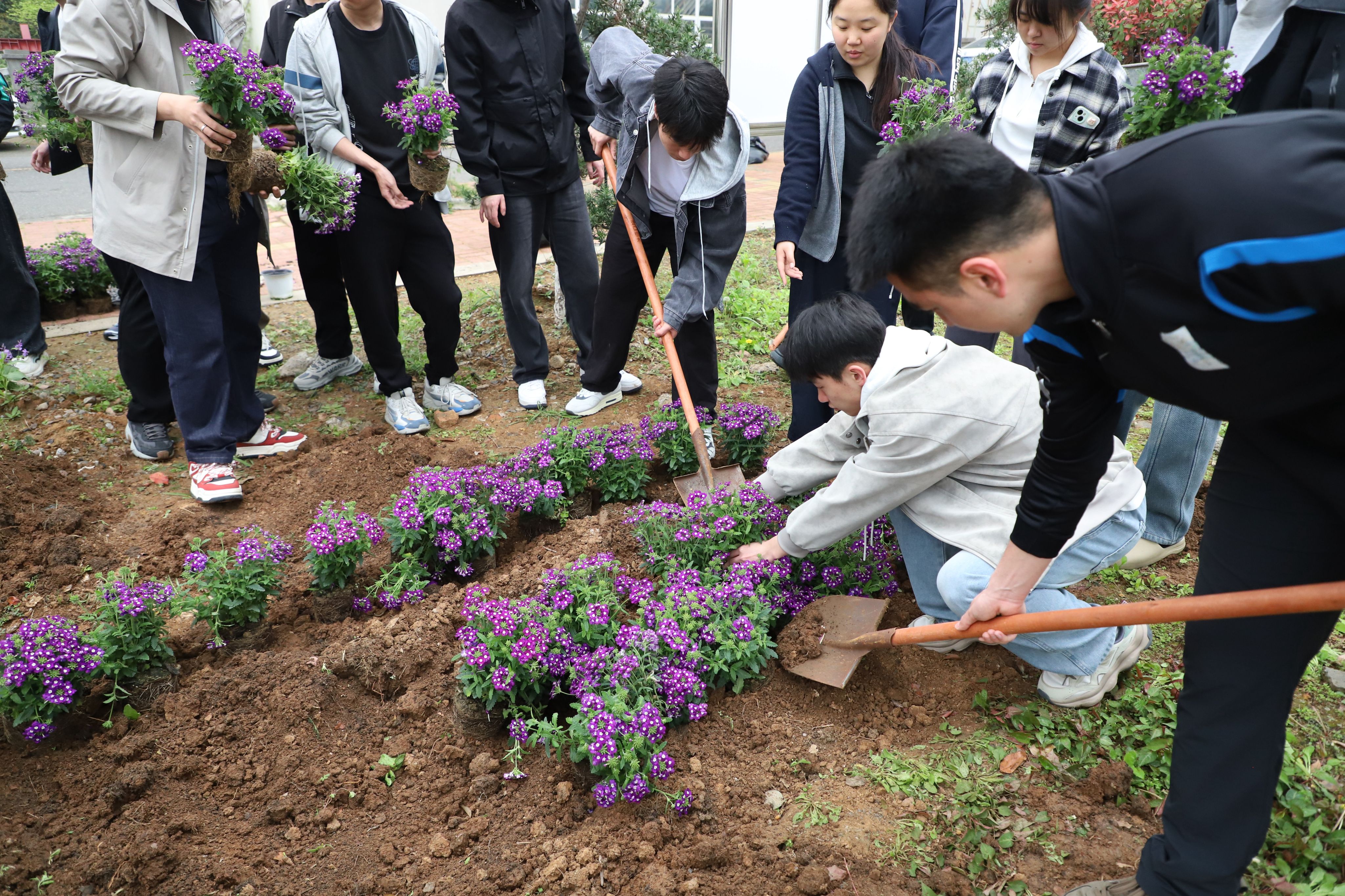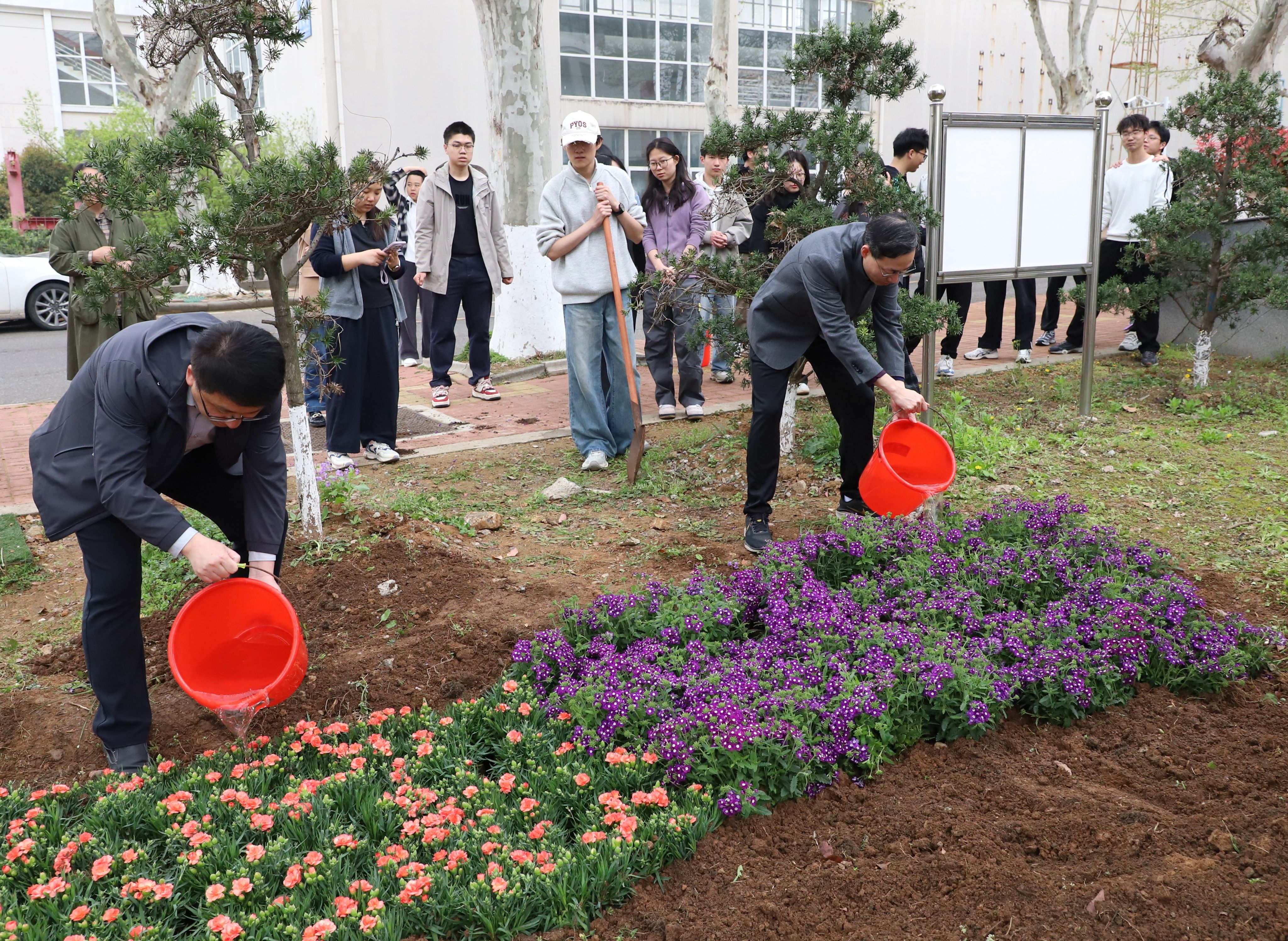 仪式后,师生共同开展“松樟园”培绿活动,大家轮流挥锹培土、浇水师生护苗,以亲手植绿的实际行动,为校园添新绿、为精神续薪火,让红色血脉与“松樟精神”在劳动实践中代代相传。